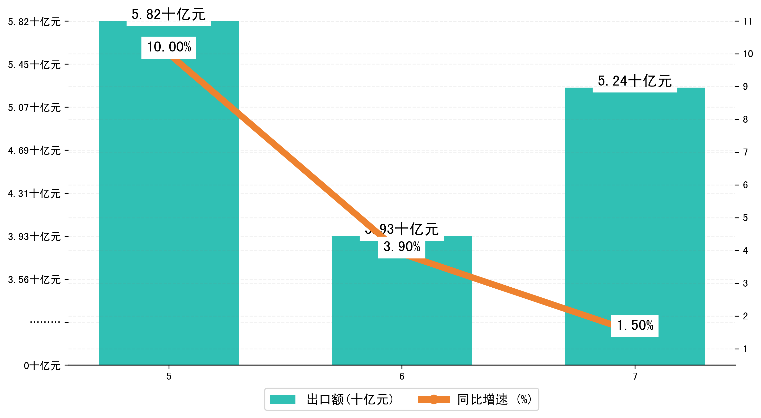 以人民币计,2023年7月沈阳市出口额为52,3822.8757万元,相比上月增加了13,0445.7861万元;相比上年同期减少了5,7325.154万元,同比增加了1.50%。