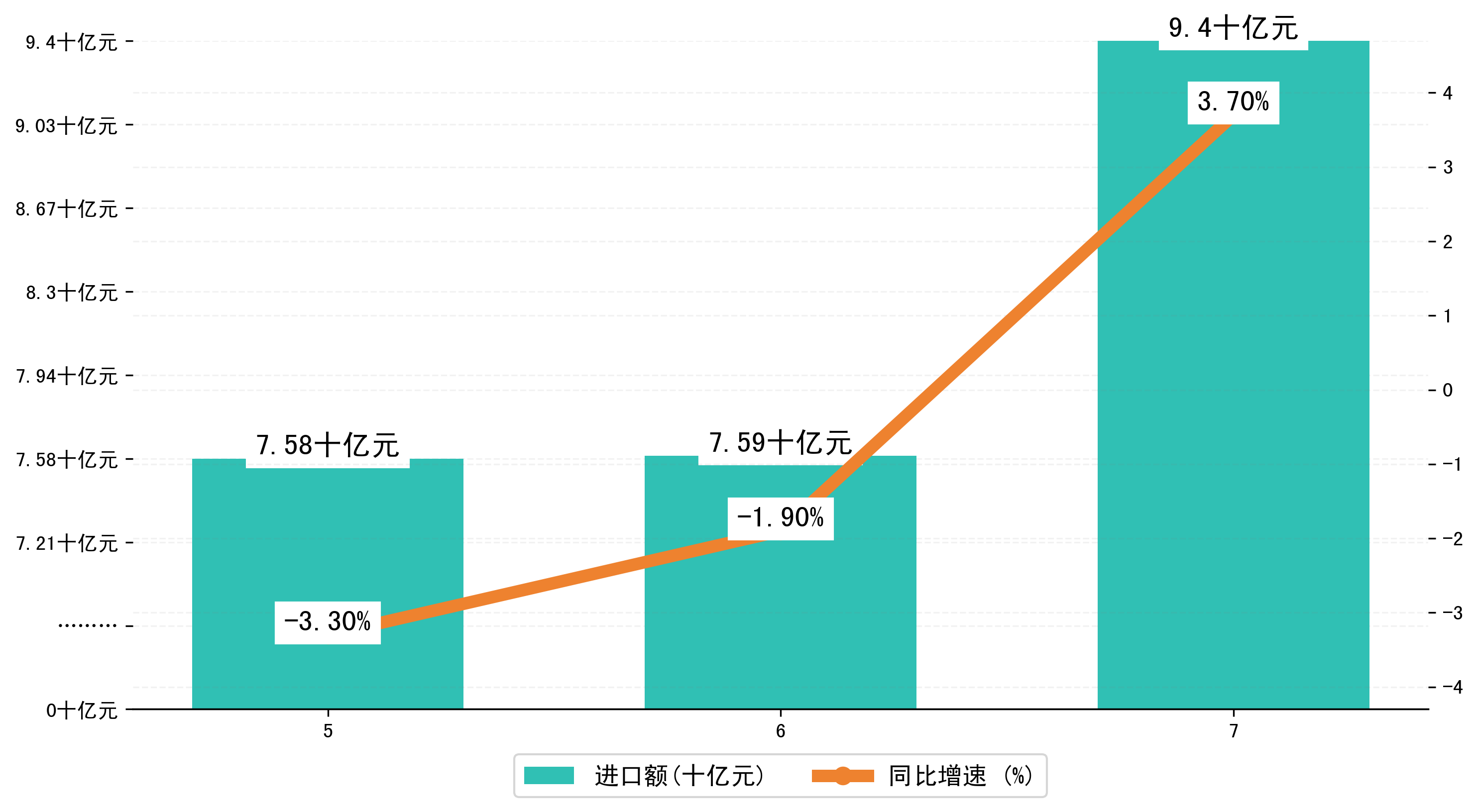 以人民币计,2023年1-7月沈阳市进口额为517,2727.4773万元,相比上年同期增加了17,4854.8744万元,同比增加了3.70%。