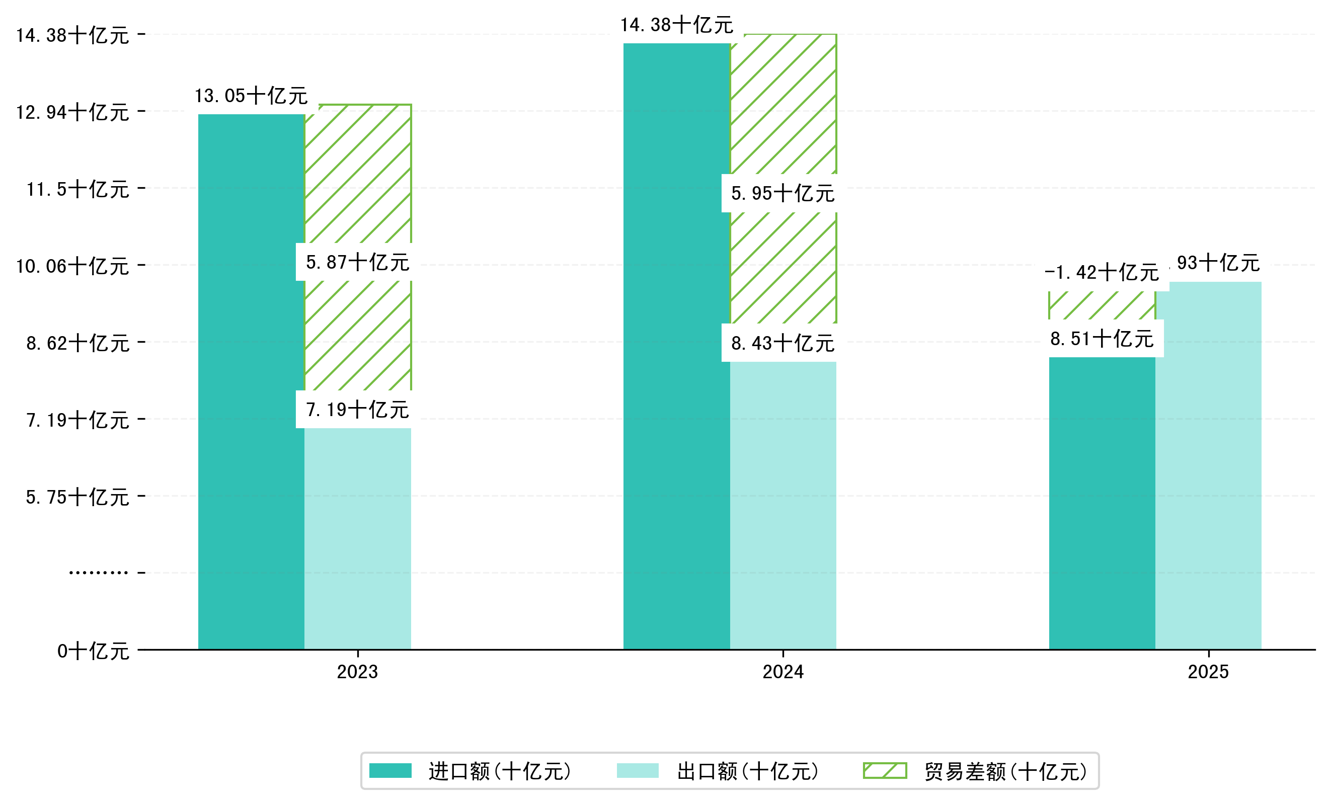以美元计,2025年2月沈阳市贸易差额为1,0349,1302万美元(贸易逆差),相比上月减少了4,0658,9001万美元;相比上年同期增加了5,1449,0666万美元,同比增加-83.25%。