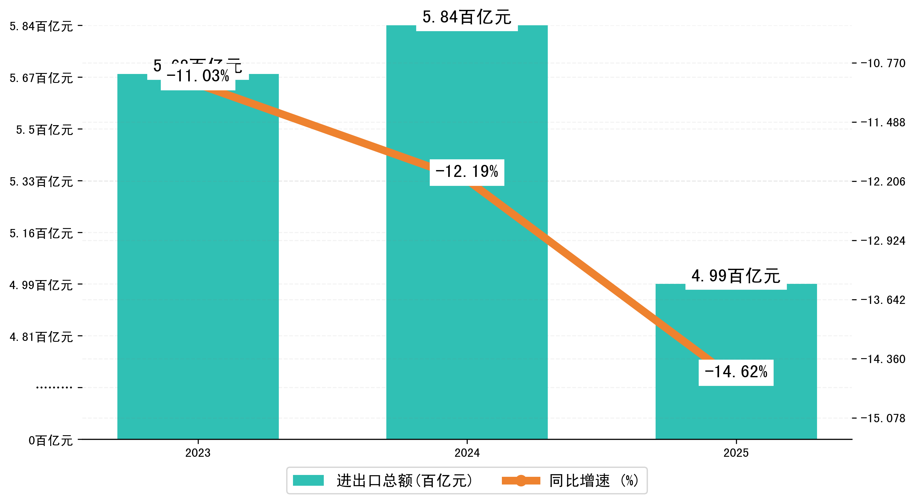 以人民币计,2025年1-5月沈阳市进出口总额为498,5074.6327万元,相比上年同期减少了85,3447.6597万元,同比减少了-14.40%。