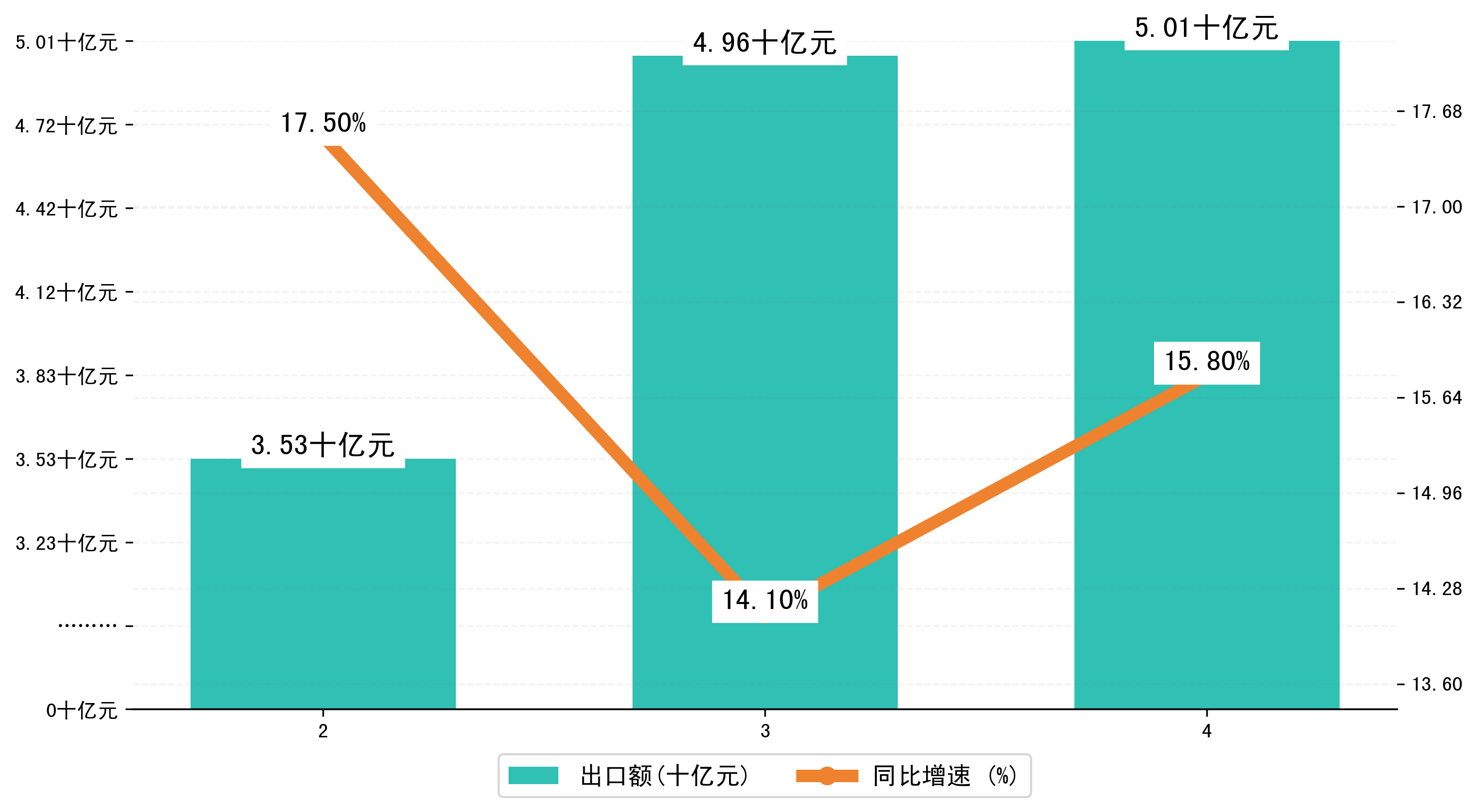 以人民币计,2025年1-4月沈阳市出口额为199,0170.2867万元,相比上年同期增加了26,9640.8022万元,同比增加了15.80%。