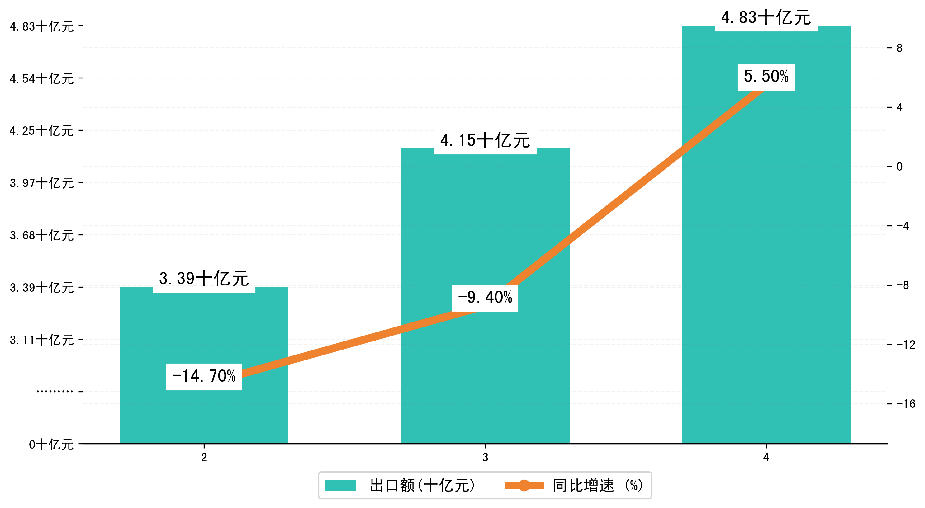 以人民币计,2023年4月沈阳市出口额为48,2940.6095万元,相比上月增加了6,7606.93万元;相比上年同期增加了20,2283.8013万元,同比增加了5.50%。