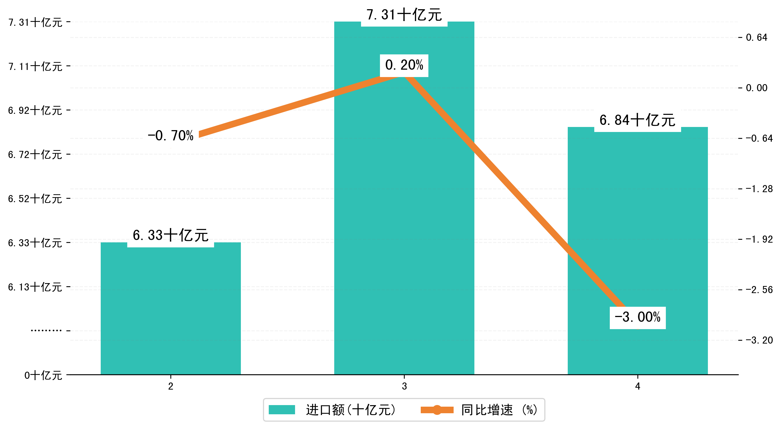 以人民币计,2023年1-4月沈阳市进口额为272,0369.6474万元,相比上年同期减少了8,8607.3253万元,同比减少了-3.00%。