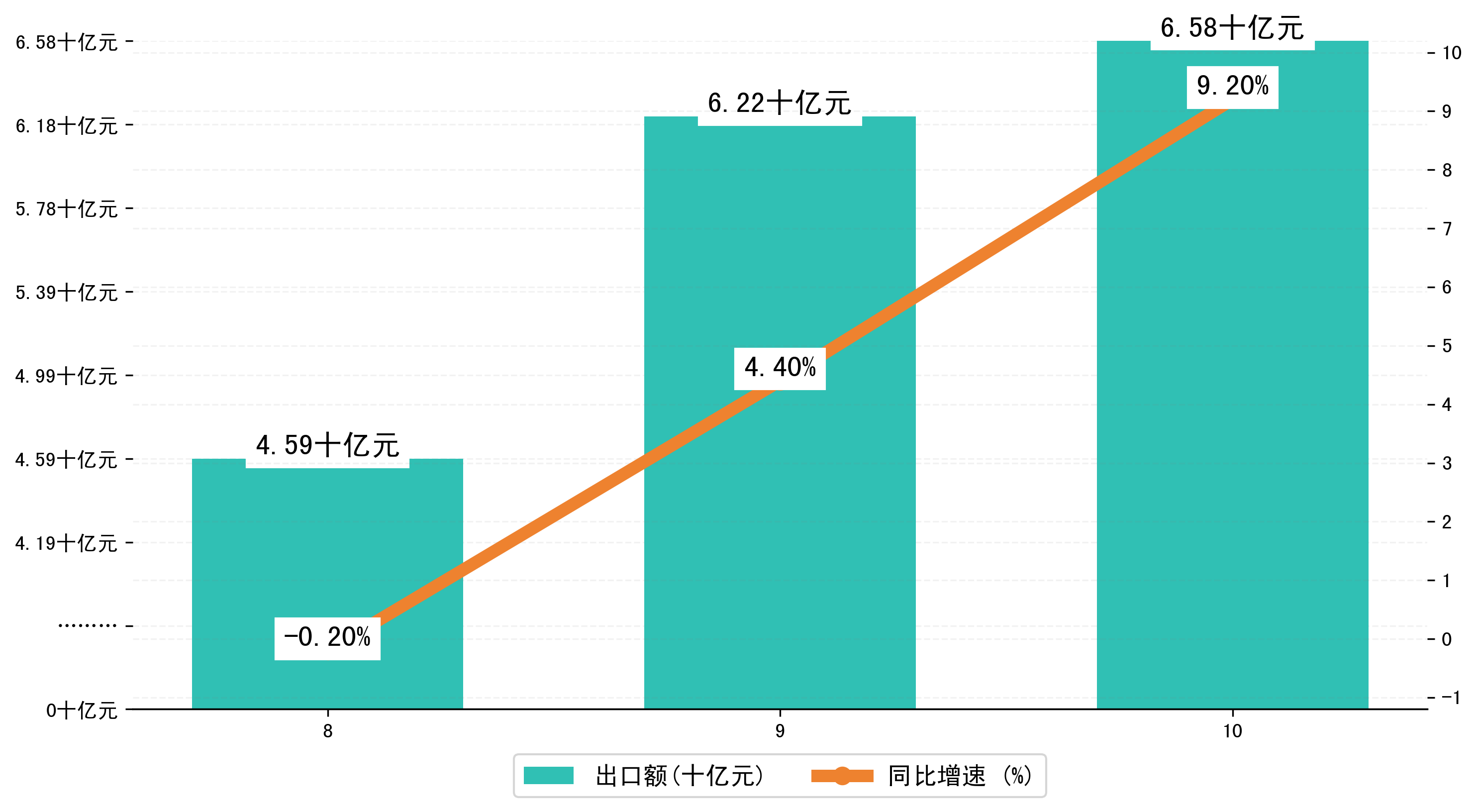 以人民币计,2024年10月沈阳市出口额为65,8258.6404万元,相比上月增加了3,6021.8506万元;相比上年同期增加了23,5341.474万元,同比增加了9.20%。