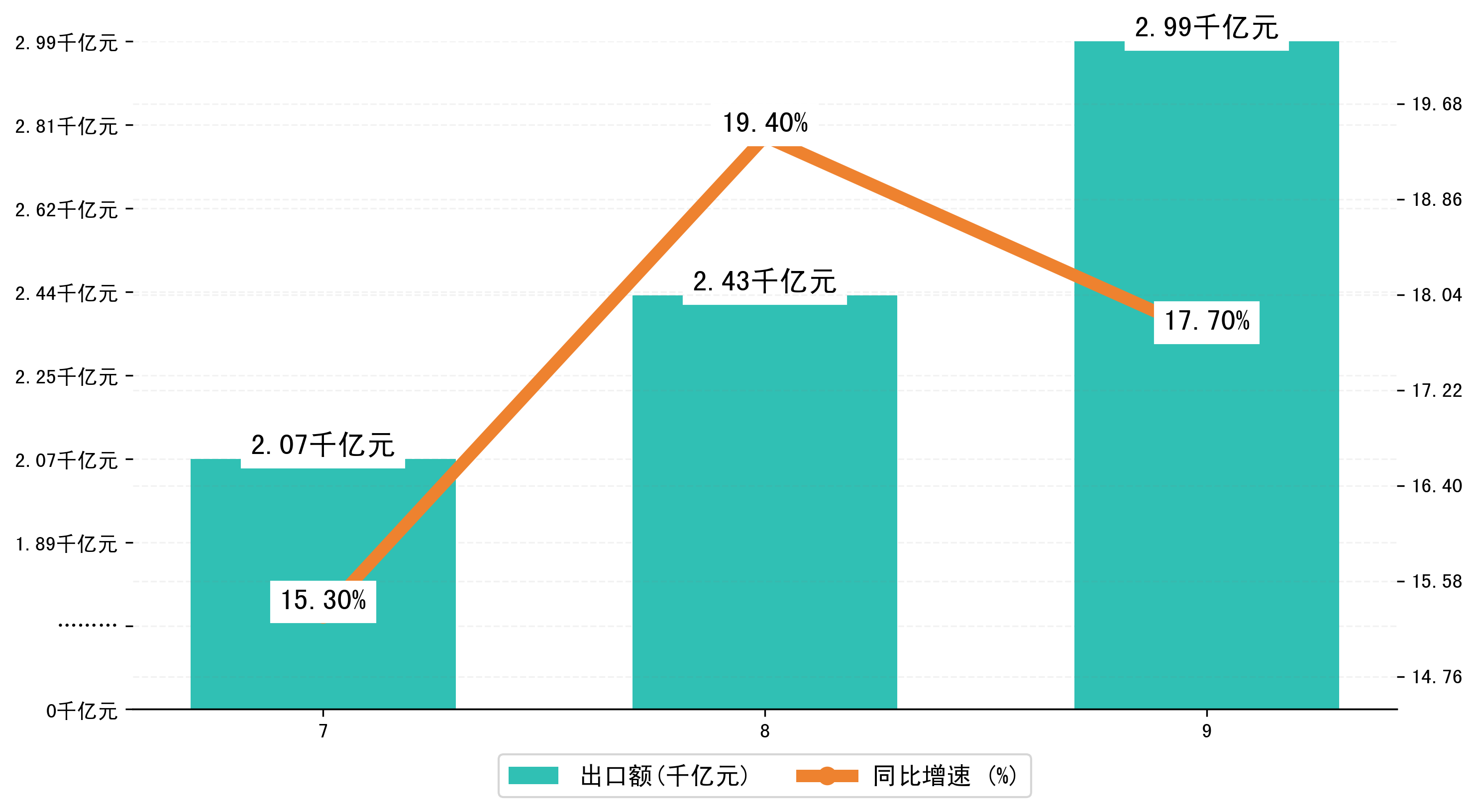 以人民币计,2023年1-9月深圳市出口额为1,7945,9829.7564万元,相比上年同期增加了2704,4030.4365万元,同比增加了17.70%。