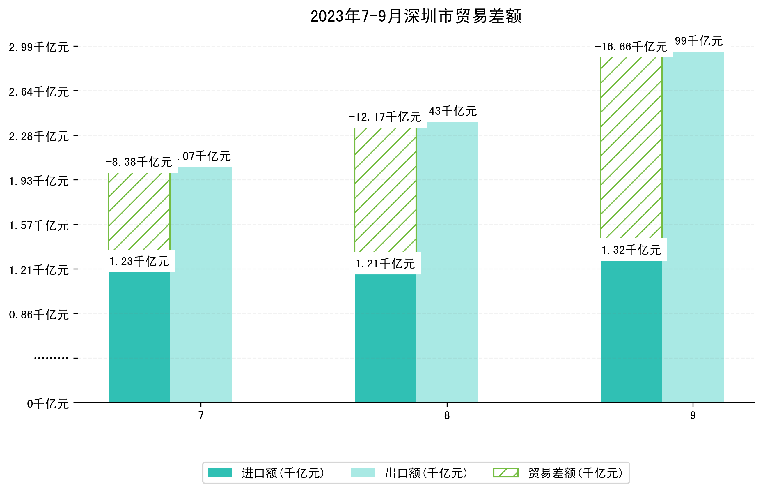 以人民币计,2023年1-9月深圳市贸易差额为7907,7836,7302万元(贸易顺差),相比上年同期增加了3515,9254,2498万元,同比增加80.06%。