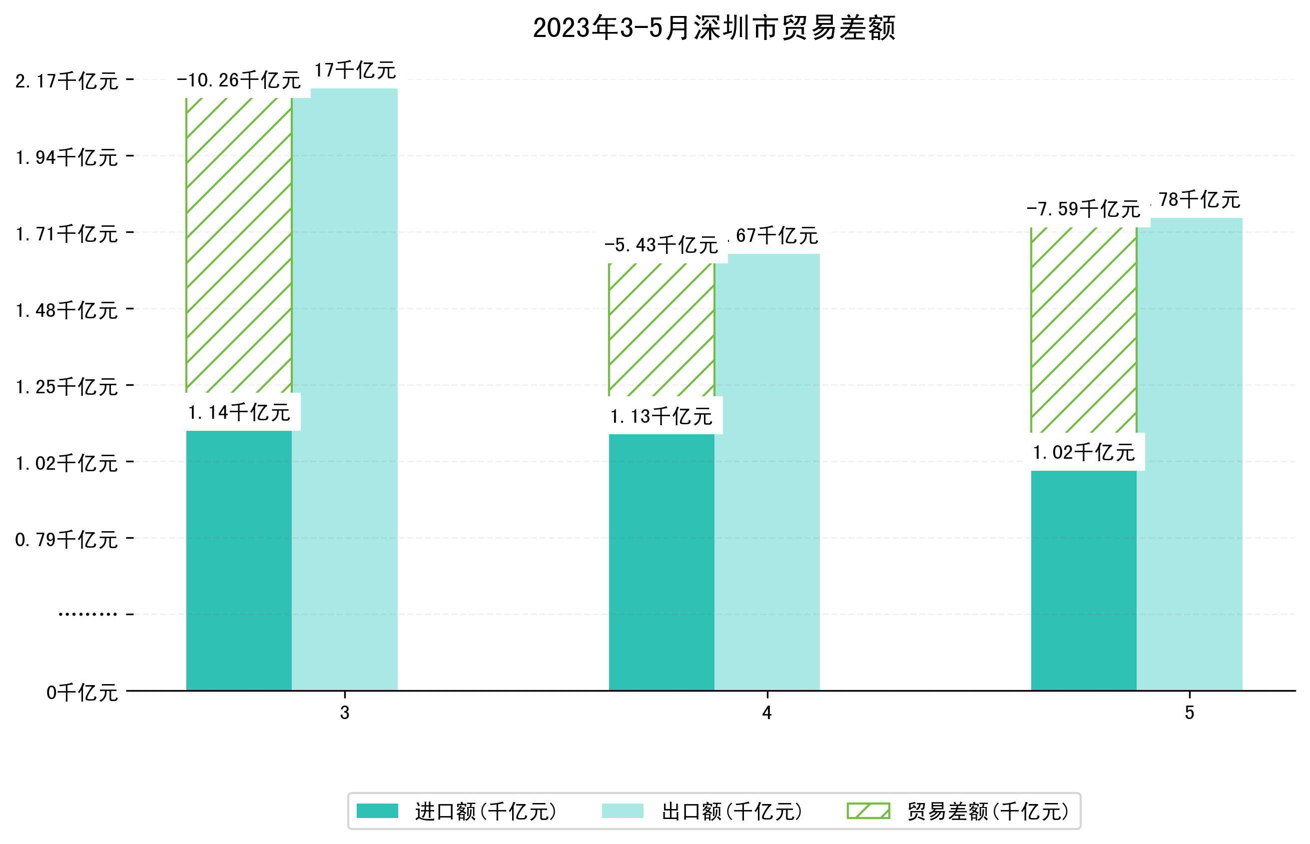 以人民币计,2023年1-5月深圳市贸易差额为3448,1905,1665万元(贸易顺差),相比上年同期增加了1740,5660,2119万元,同比增加101.93%。