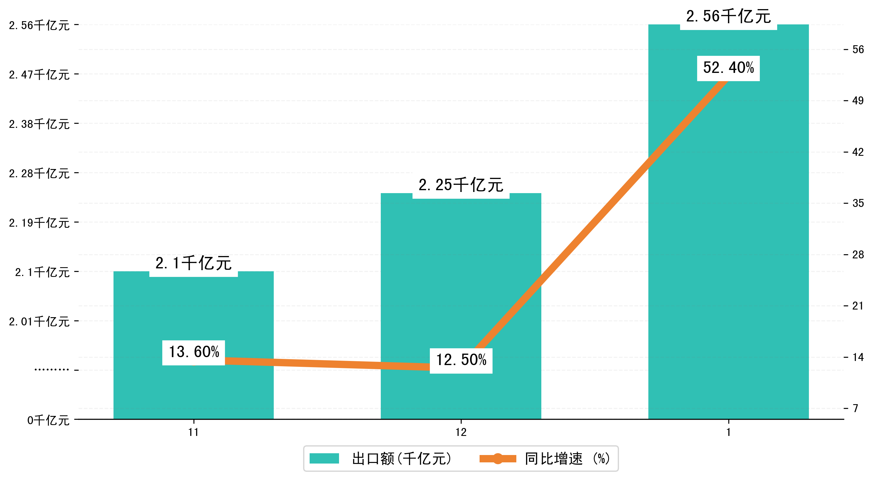 以人民币计,2024年1-1月深圳市出口额为2558,6358.1485万元,相比上年同期增加了876,3286.7279万元,同比增加了52.40%。