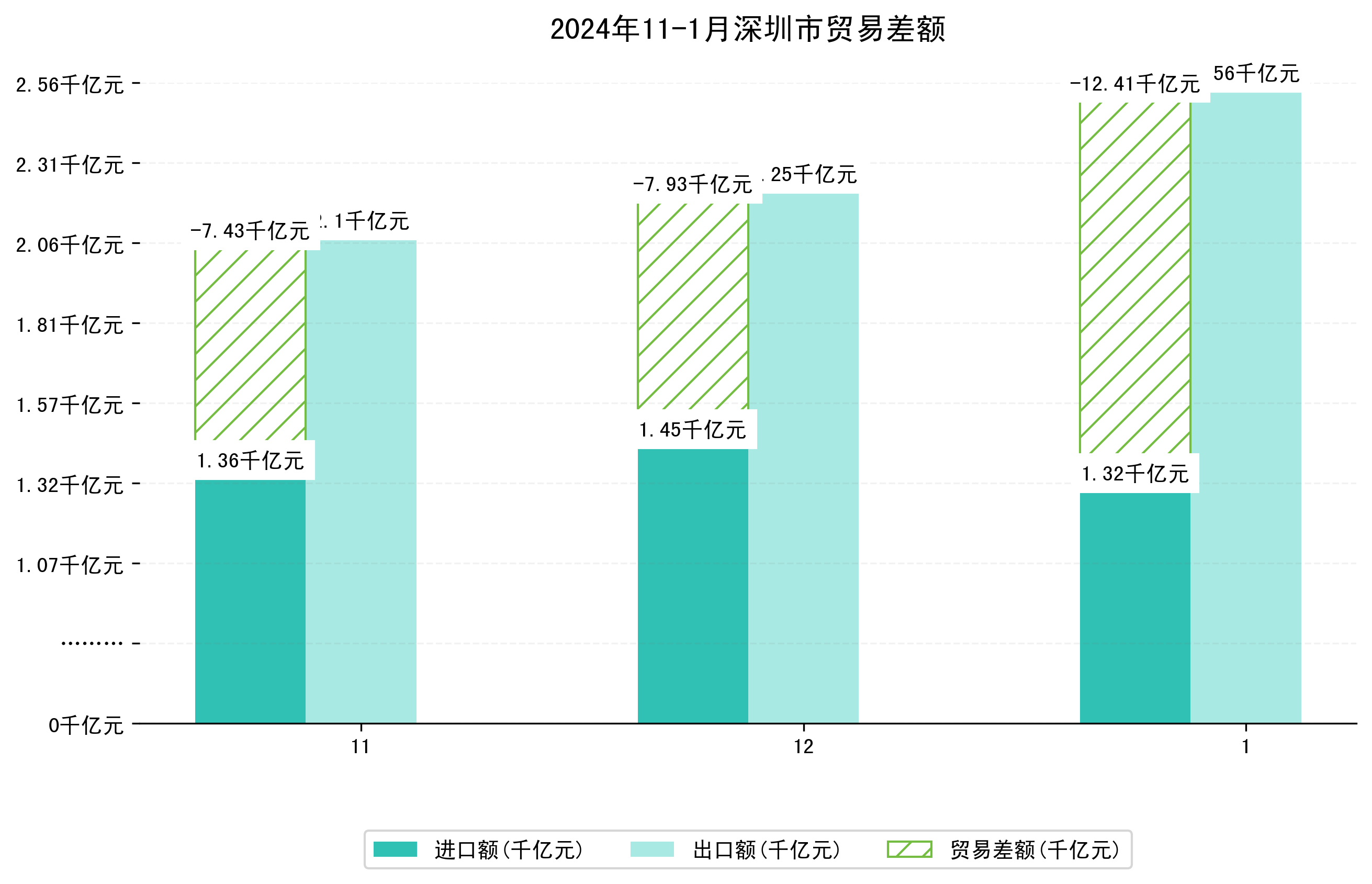 以人民币计,2024年1月深圳市贸易差额为1241,3957,7161万元(贸易顺差),相比上月增加了448,7478,6342万元,即64,2083,2889万美元;相比上年同期增加了404,2506,0447万元,同比增加48.29%。