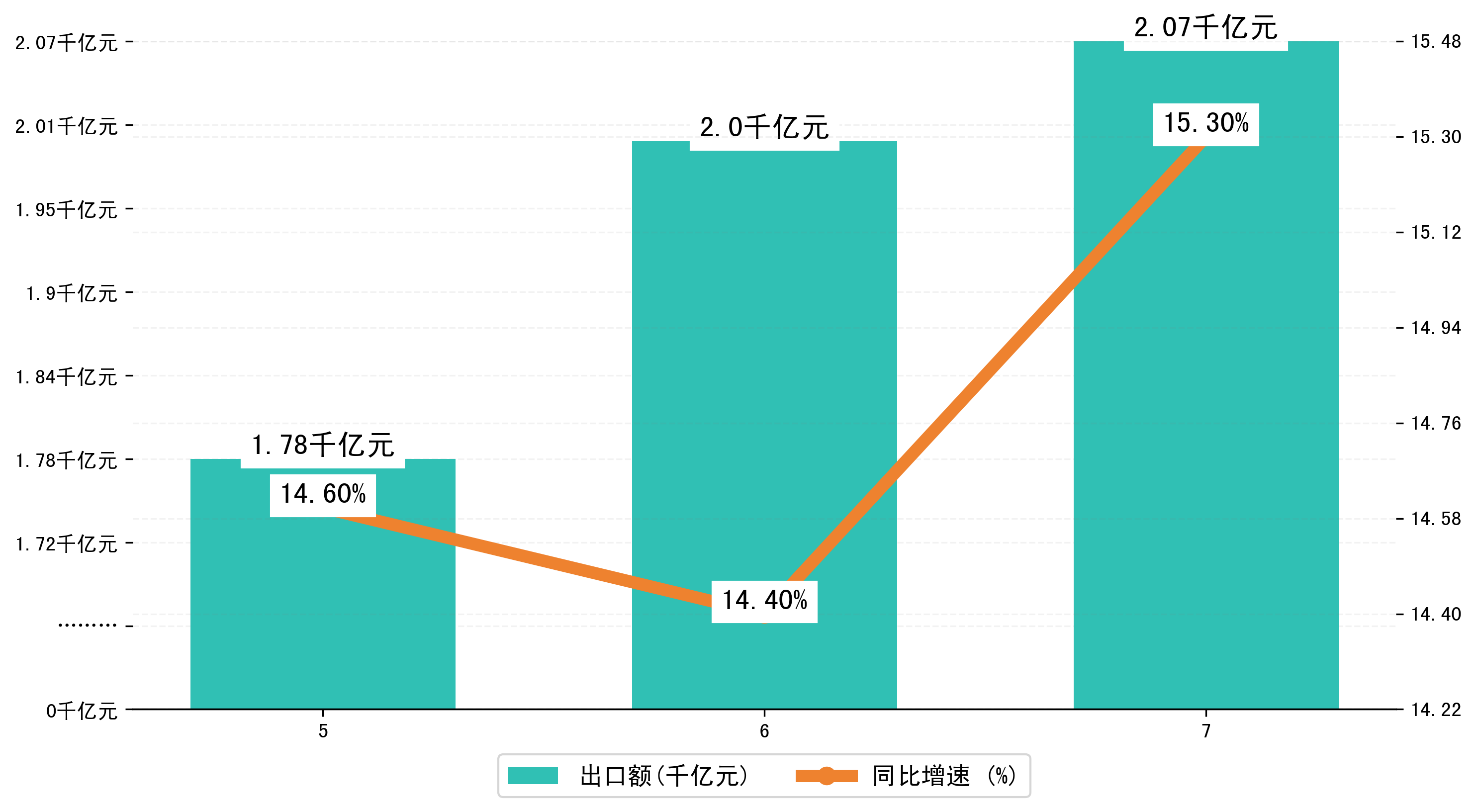 以人民币计,2023年7月深圳市出口额为2070,9879.9361万元,相比上月增加了70,0104.4586万元;相比上年同期增加了349,3078.7701万元,同比增加了15.30%。