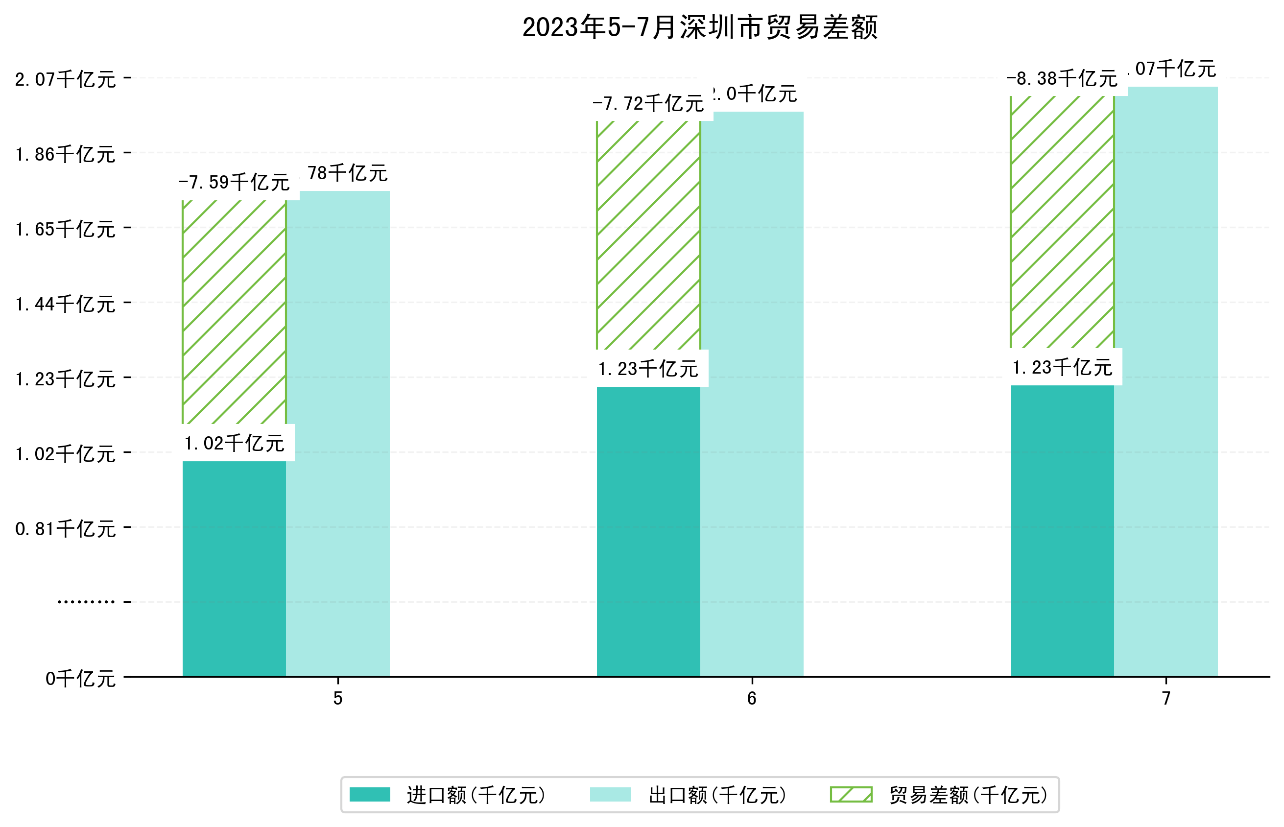 以人民币计,2023年1-7月深圳市贸易差额为5030,1445,8960万元(贸易顺差),相比上年同期增加了2387,1791,6138万元,同比增加90.32%。