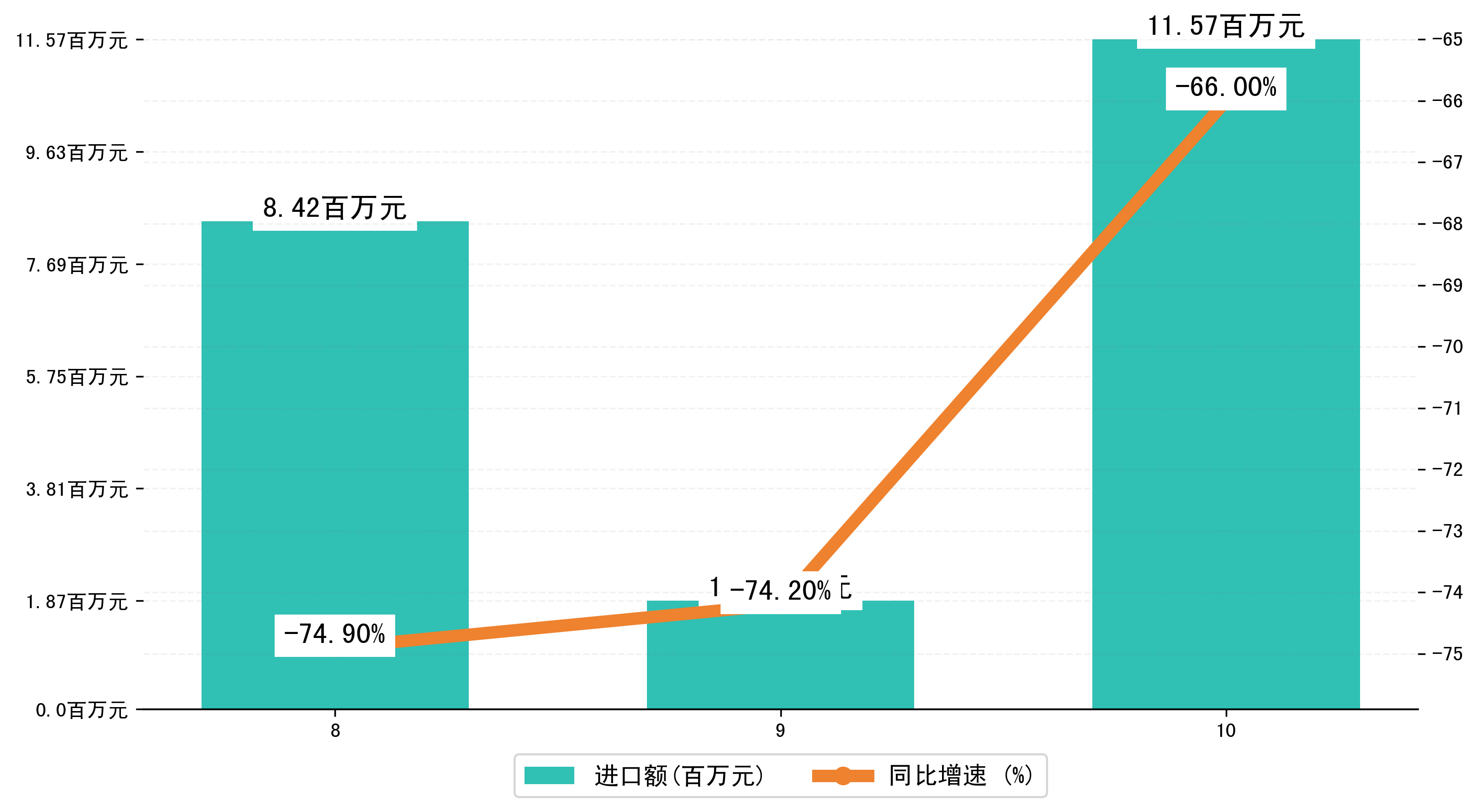 以美元计,2024年1-10月石河子市进口额为663.4407万美元,相比上年同期减少了1285.4772万美元,同比减少-66.00%。