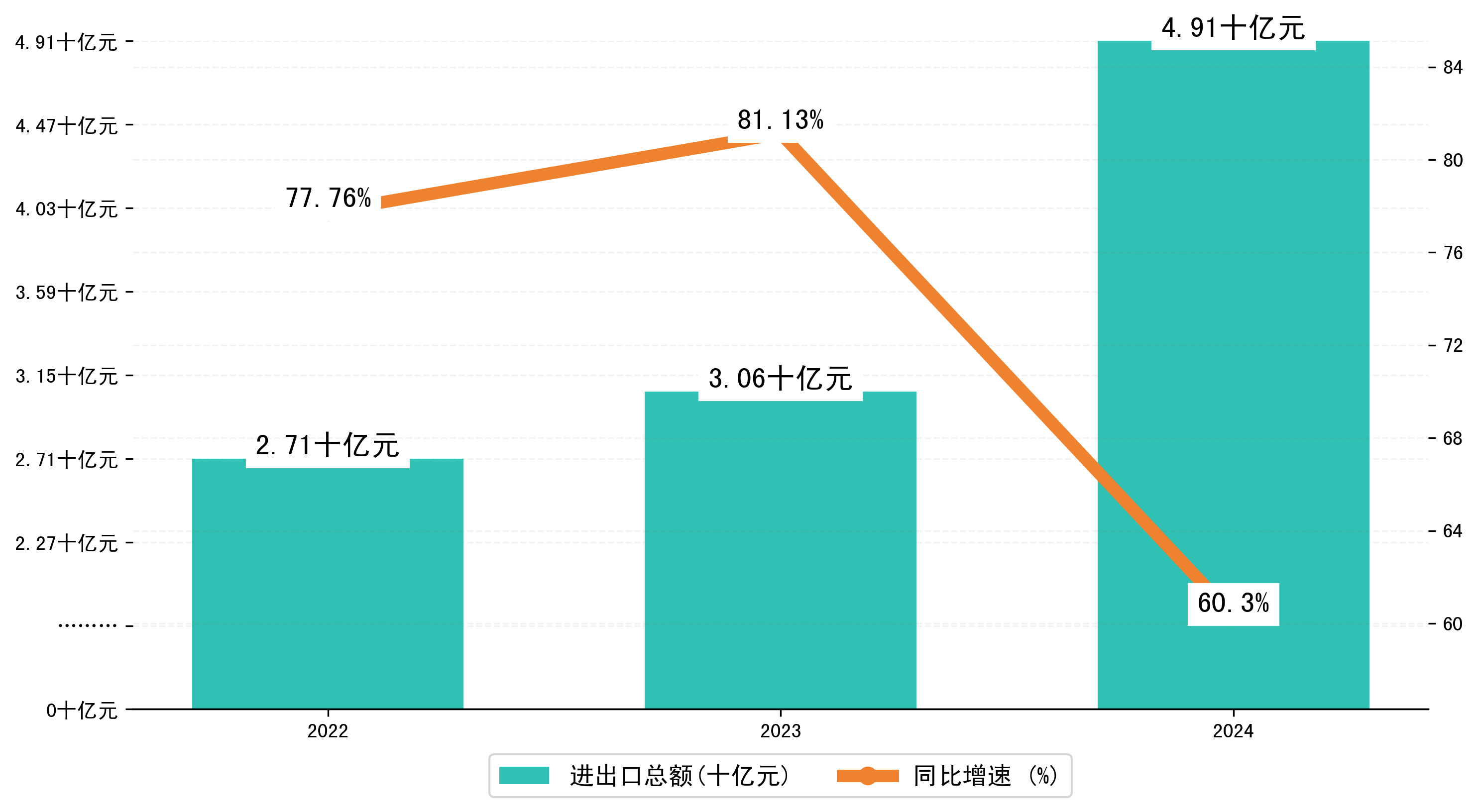 以美元计,2024年1-10月石河子市进出口总额为6,9049.6555万美元,相比上年同期增加了2,5496.2208万美元,同比增加58.60%。