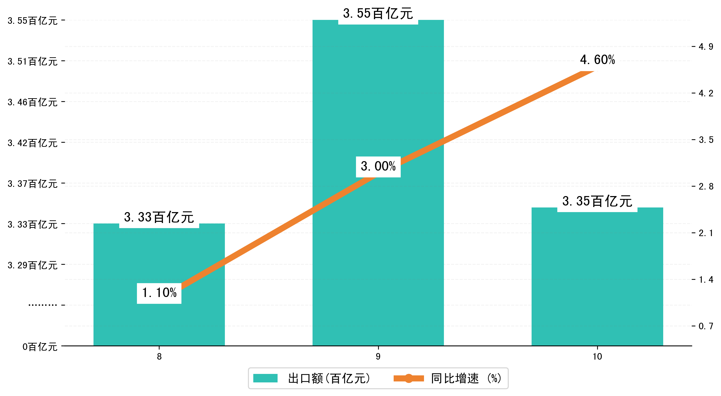 以人民币计,2024年10月辽宁省出口额为334,7403.4056万元,相比上月减少了20,2535.0268万元;相比上年同期增加了57,7116.2362万元,同比增加了4.60%。