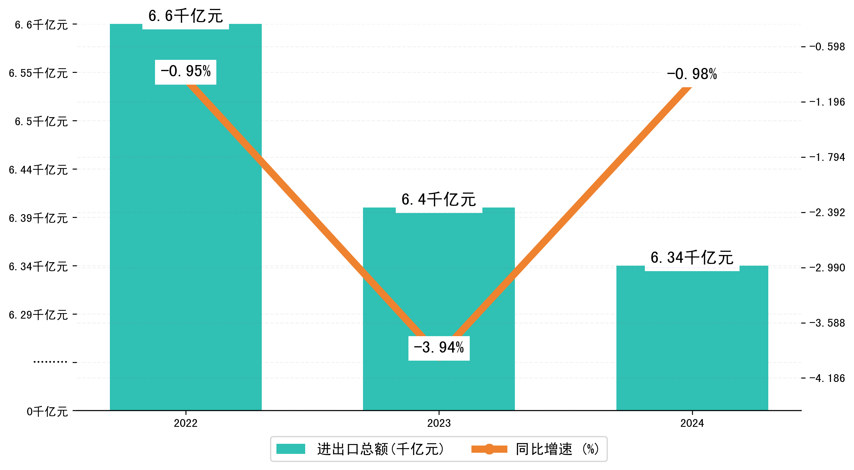 以人民币计,2024年1-10月辽宁省进出口总额为6340,8507.0403万元,相比上年同期减少了62,4647.5771万元,同比减少了-1.00%。