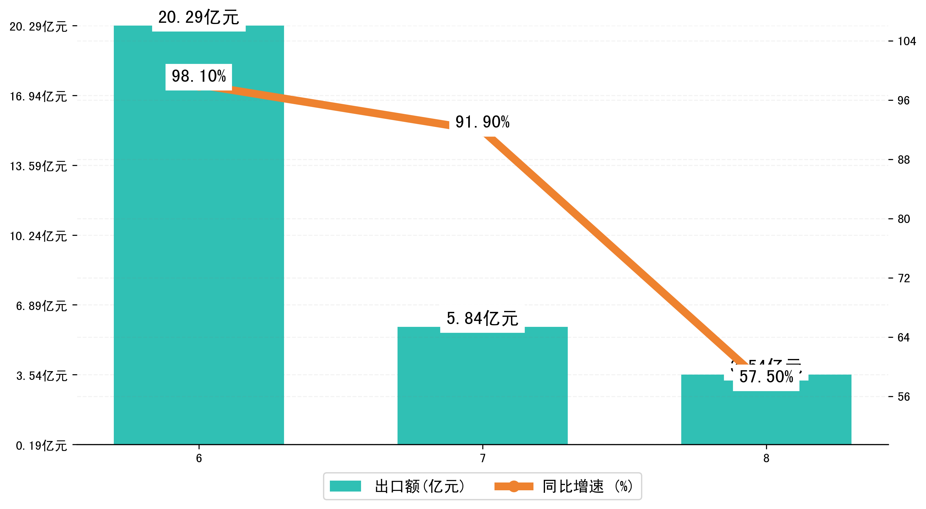 以美元计,2024年1-8月石河子市出口额为5,5054.8239万美元,相比上年同期增加了1,9532.2542万美元,同比增加55.00%。