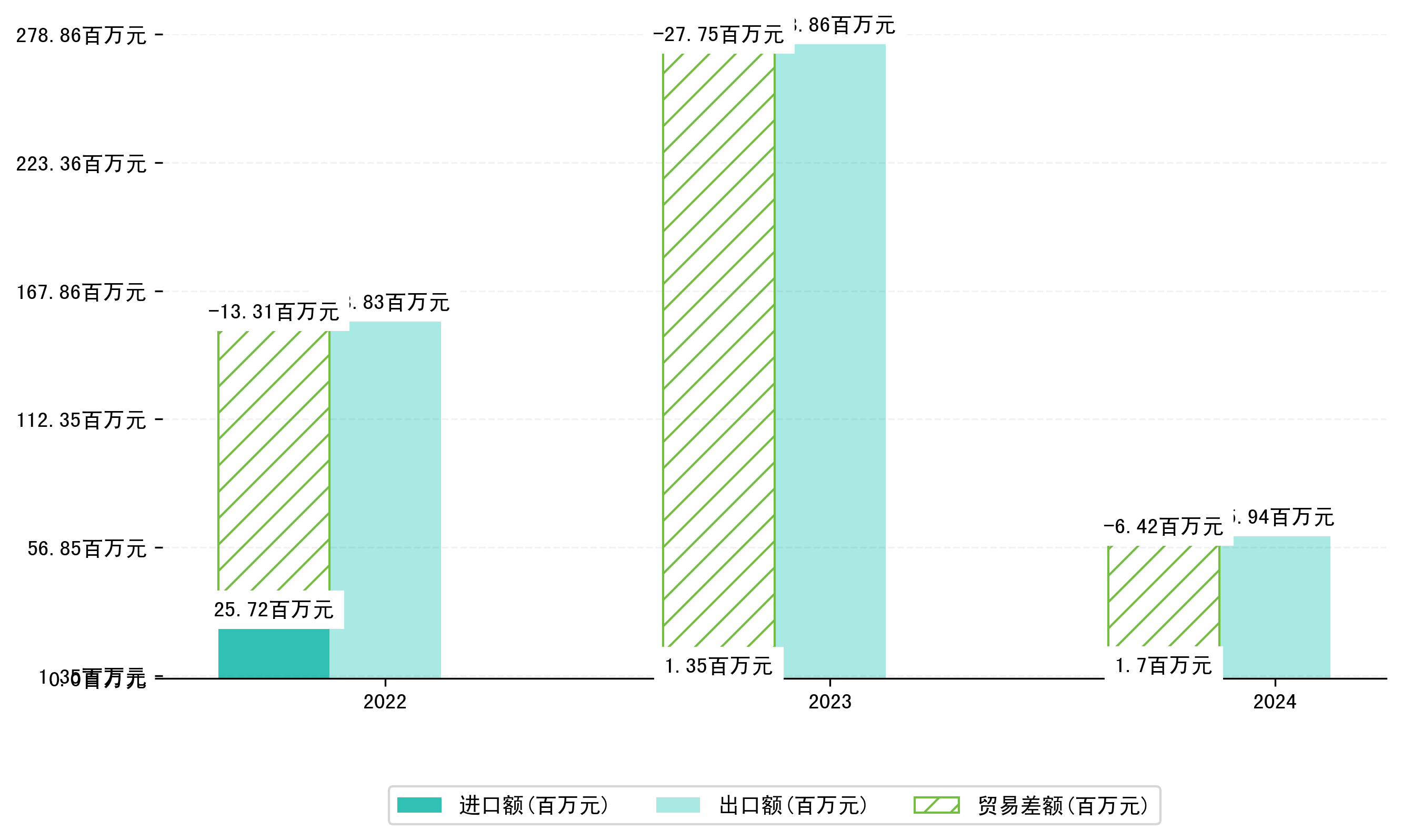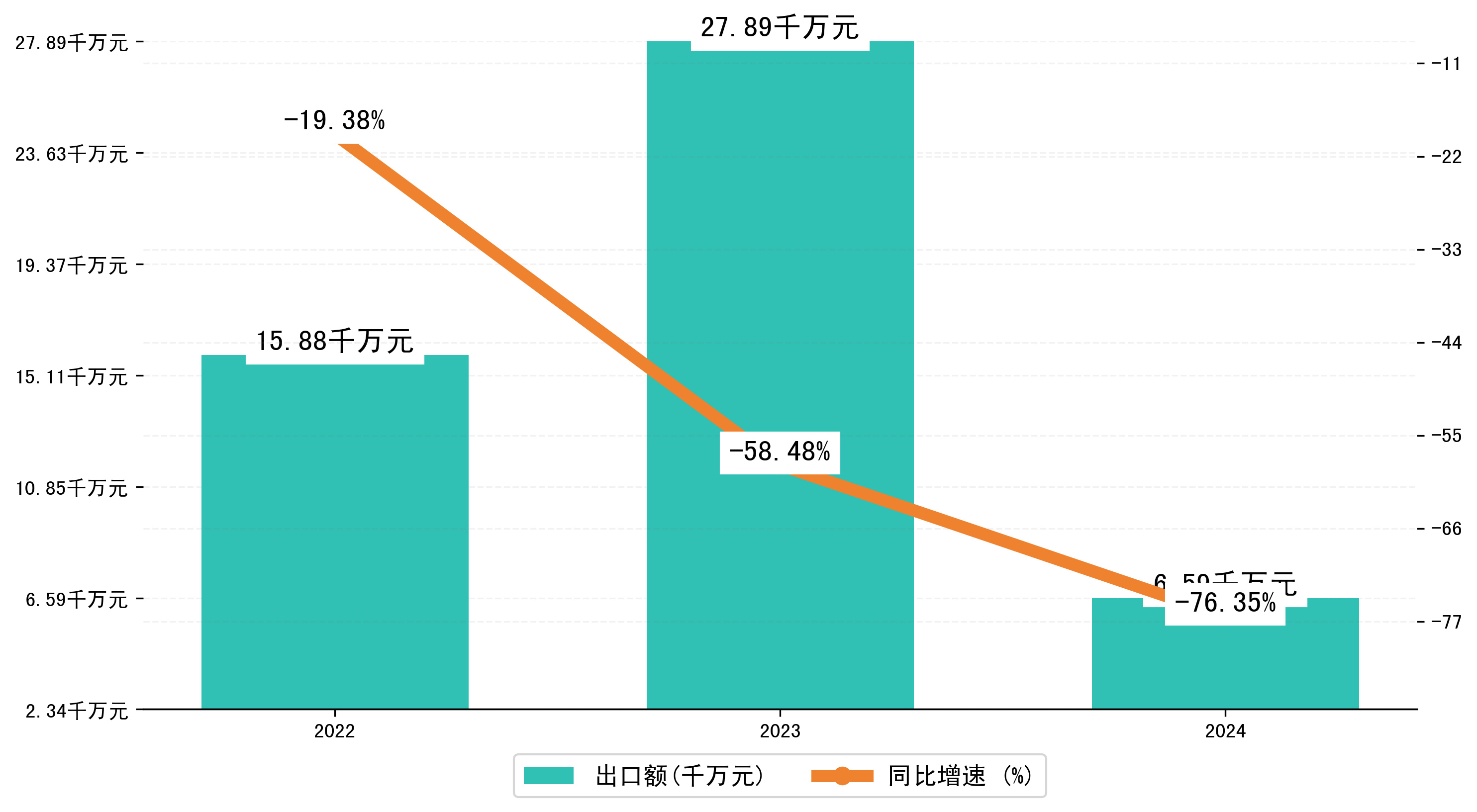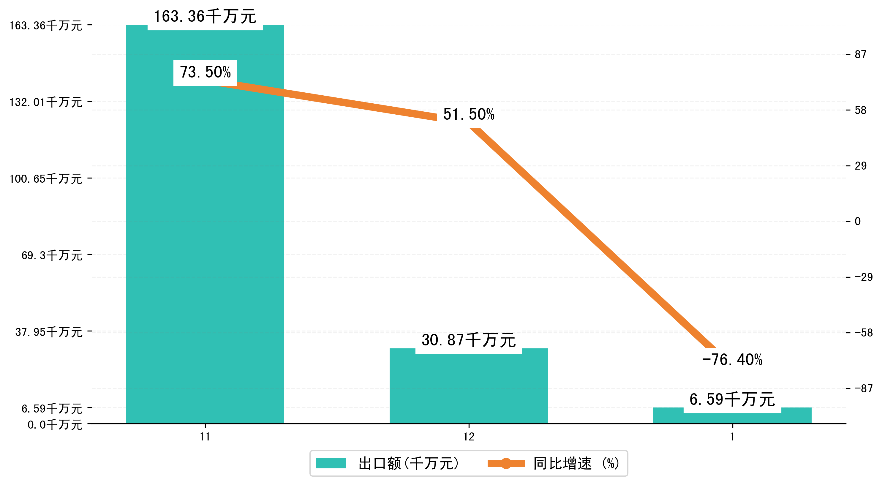 以美元计,2024年1-1月石河子市出口额为929.9285万美元,相比上年同期减少了3065.2487万美元,同比减少-76.70%。