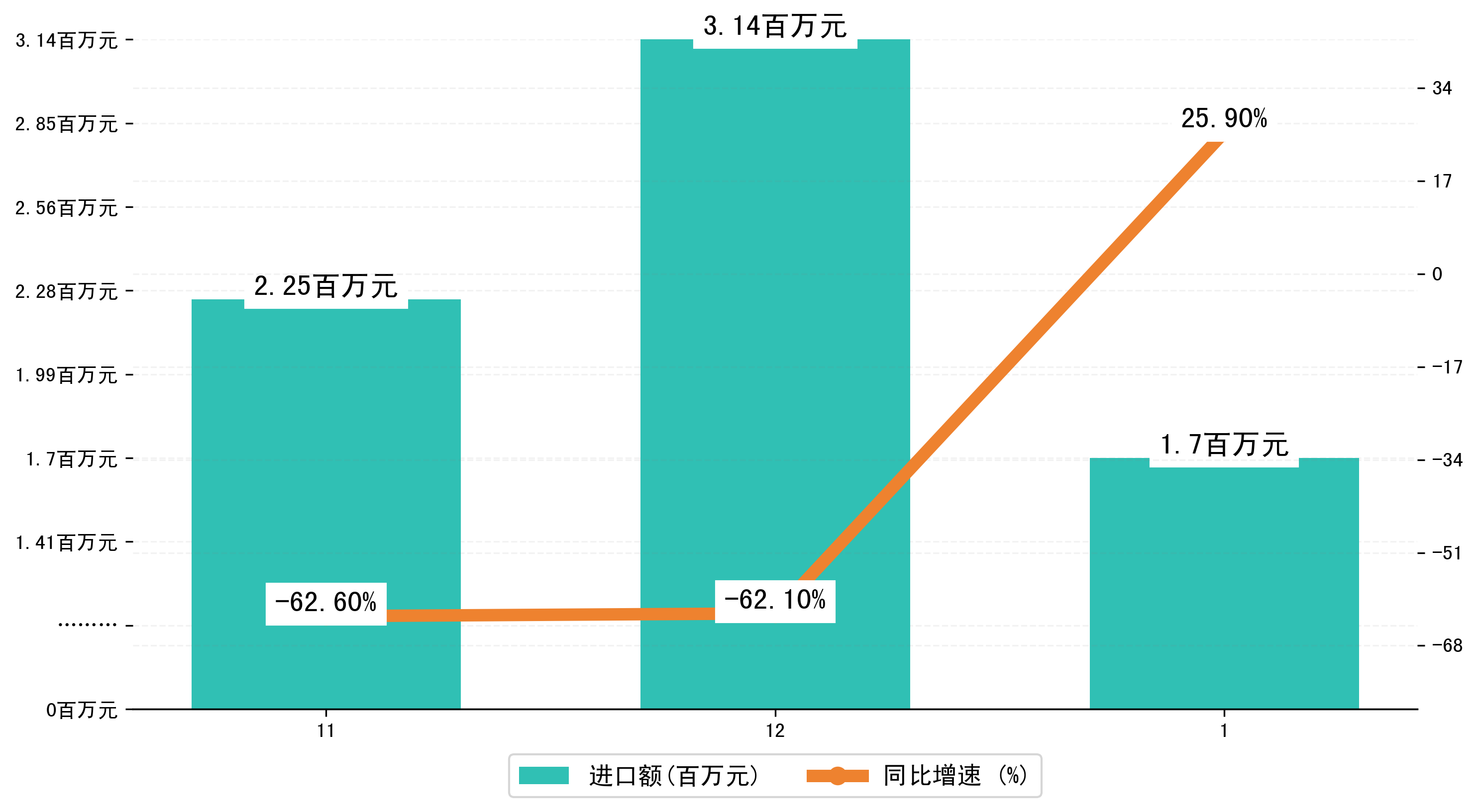 以美元计,2024年1-1月石河子市进口额为23.9684万美元,相比上年同期增加了4.5725万美元,同比增加23.60%。