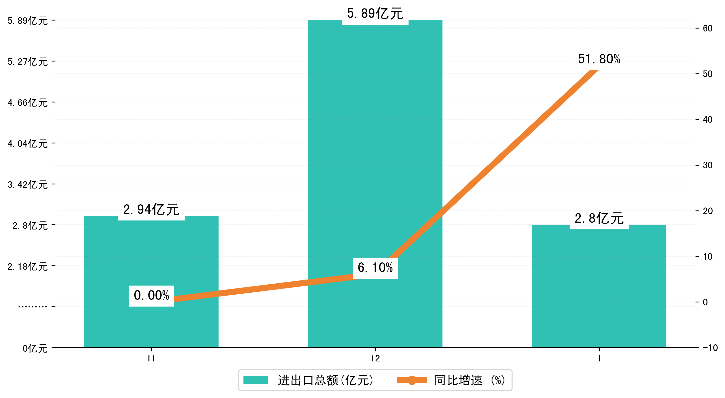 以人民币计,2023年1-1月石河子市进出口总额为2,8020.9859万元,相比上年同期增加了9566.7446万元,同比增加了51.80%。