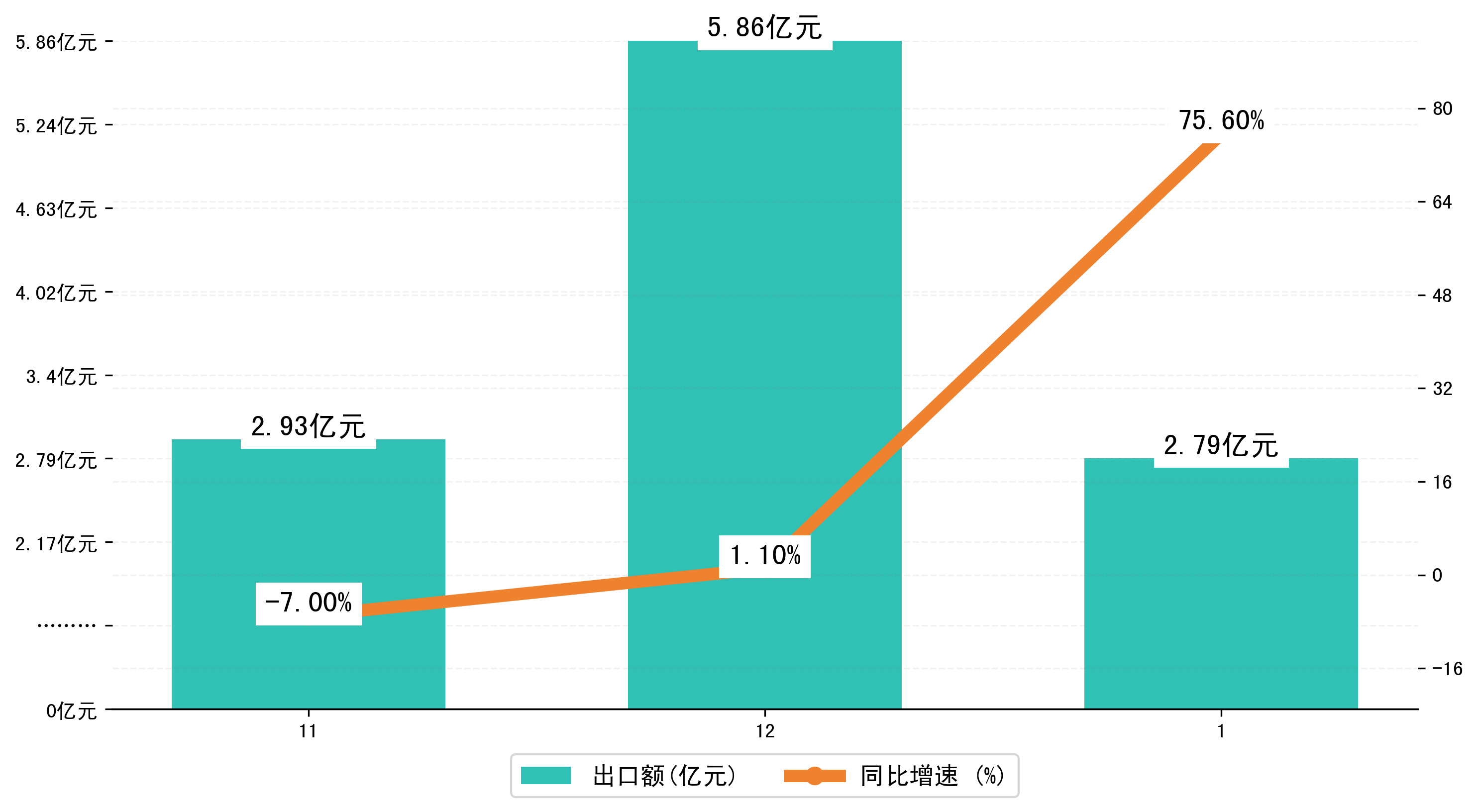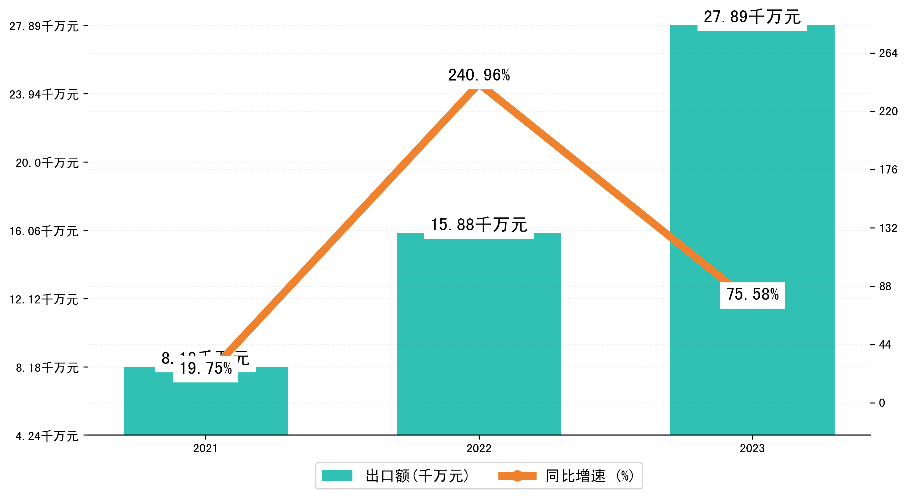 以人民币计,2023年1-1月石河子市出口额为2,7885.8936万元,相比上年同期增加了1,2003.3473万元,同比增加了75.60%。