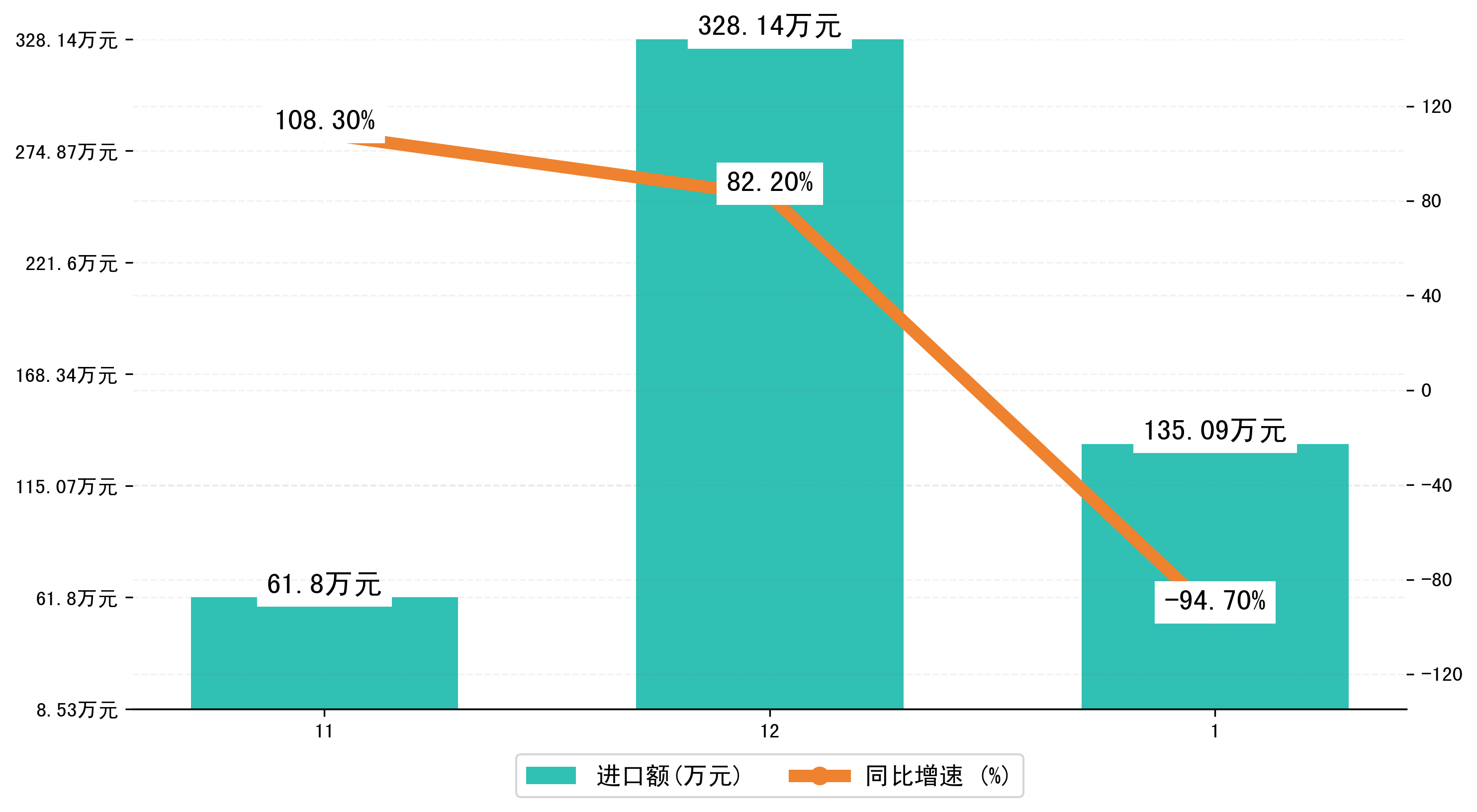 以美元计,2023年1-1月石河子市进口额为19.3959万美元,相比上年同期减少了384.2226万美元,同比减少-95.20%。