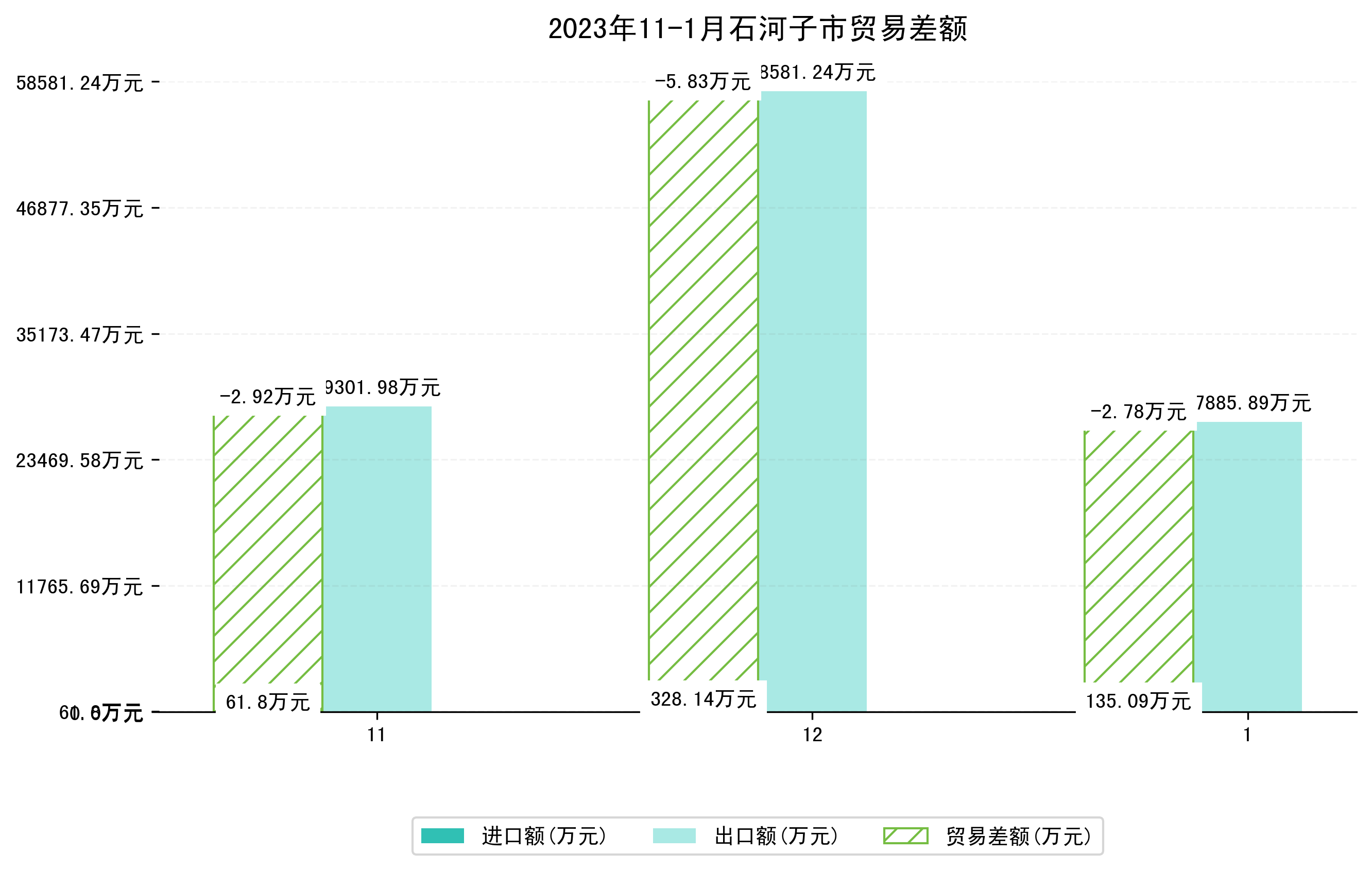 以人民币计,2023年1-1月石河子市贸易差额为2,7750,8013万元(贸易顺差),相比上年同期增加了1,4439,9500万元,同比增加108.48%。