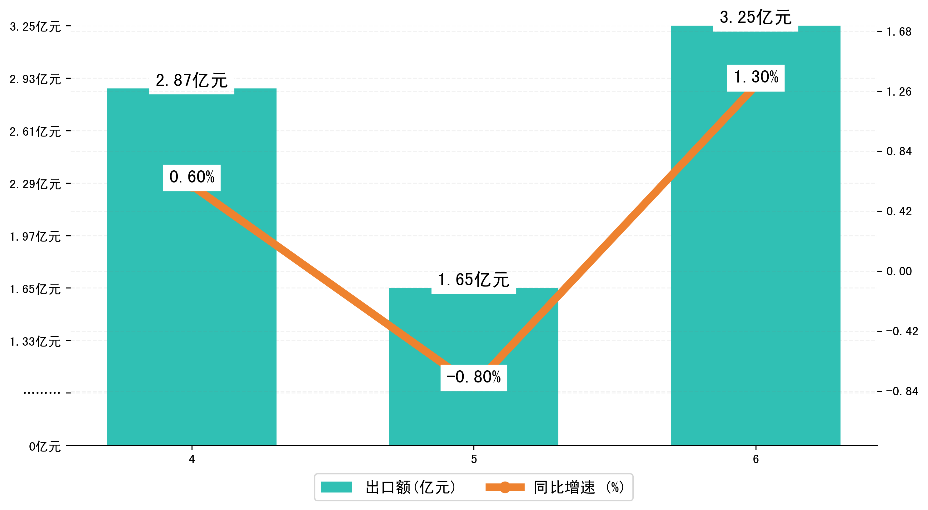 以人民币计,2023年1-6月石河子市出口额为15,1978.075万元,相比上年同期增加了1945.5881万元,同比增加了1.30%。