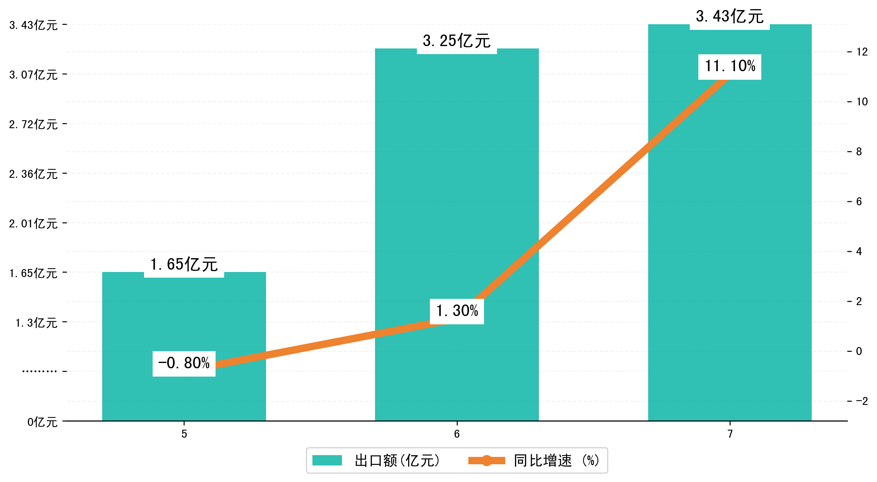 以人民币计,2023年7月石河子市出口额为3,4285.915万元,相比上月增加了1750.5752万元;相比上年同期增加了1,6552.2611万元,同比增加了11.10%。
