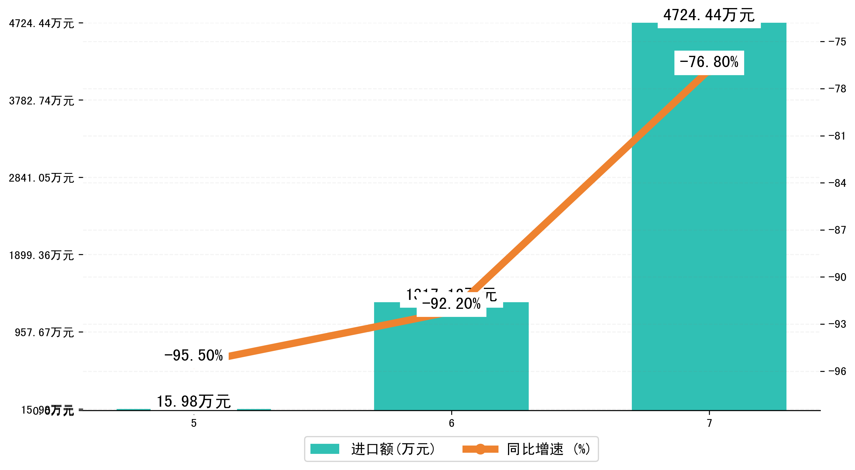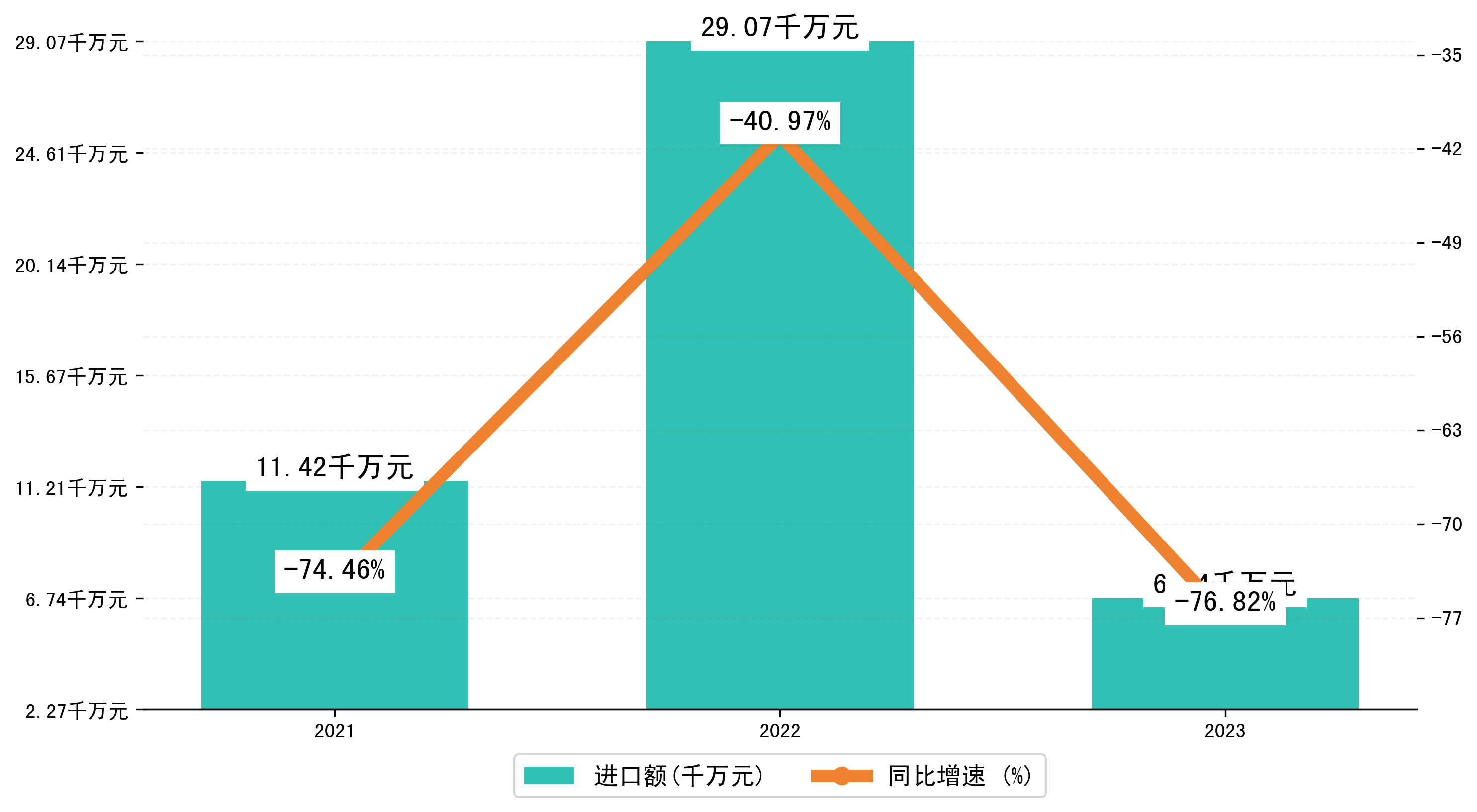 以美元计,2023年1-7月石河子市进口额为947.7961万美元,相比上年同期减少了3499.0645万美元,同比减少-78.70%。