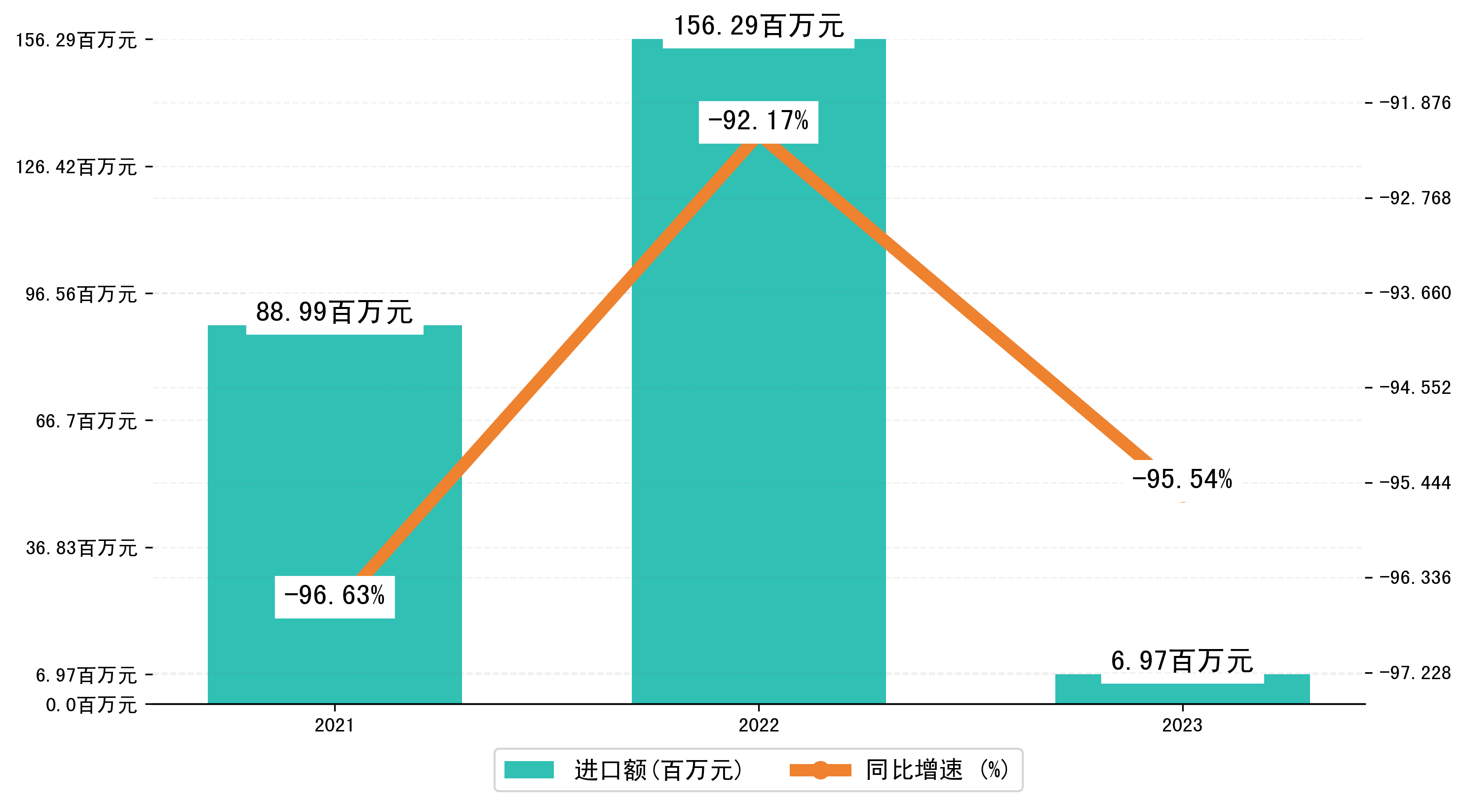 以美元计,2023年5月石河子市进口额为2.3304万美元,相比上月增加了0.5714万美元;相比上年同期减少了623.1634万美元,同比减少-95.90%。