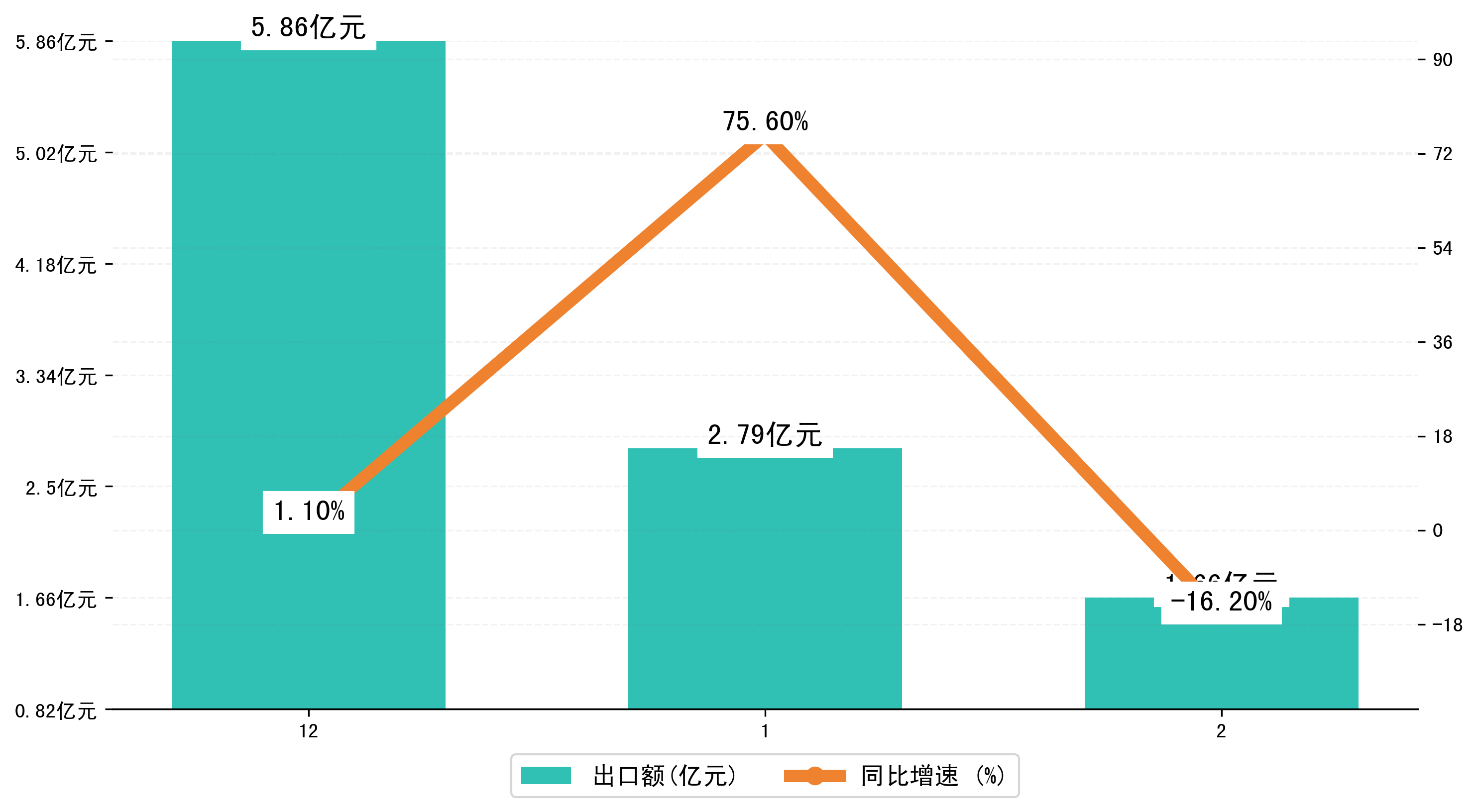 以人民币计,2023年1-2月石河子市出口额为4,4495.9999万元,相比上年同期减少了8582.3864万元,同比减少了-16.20%。