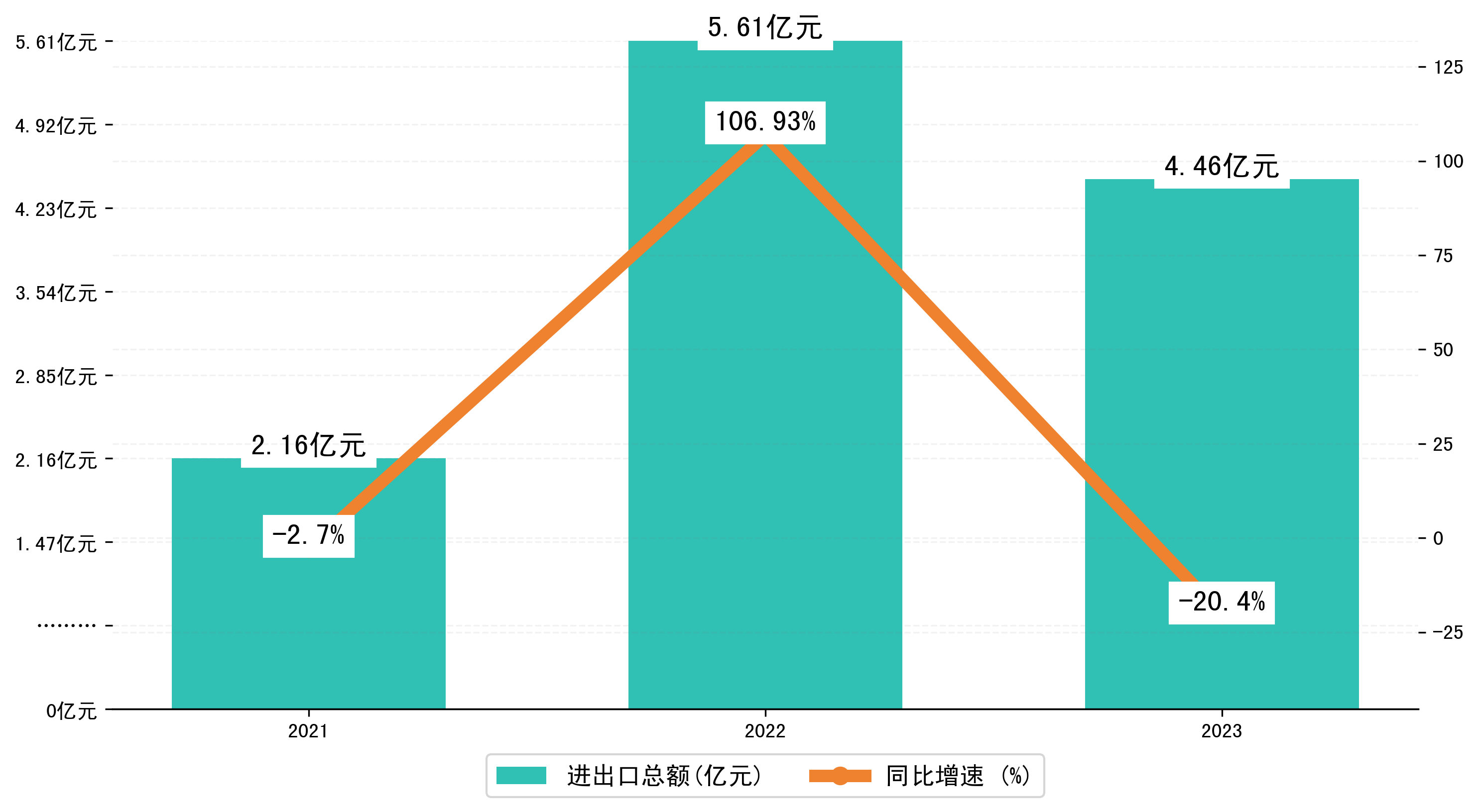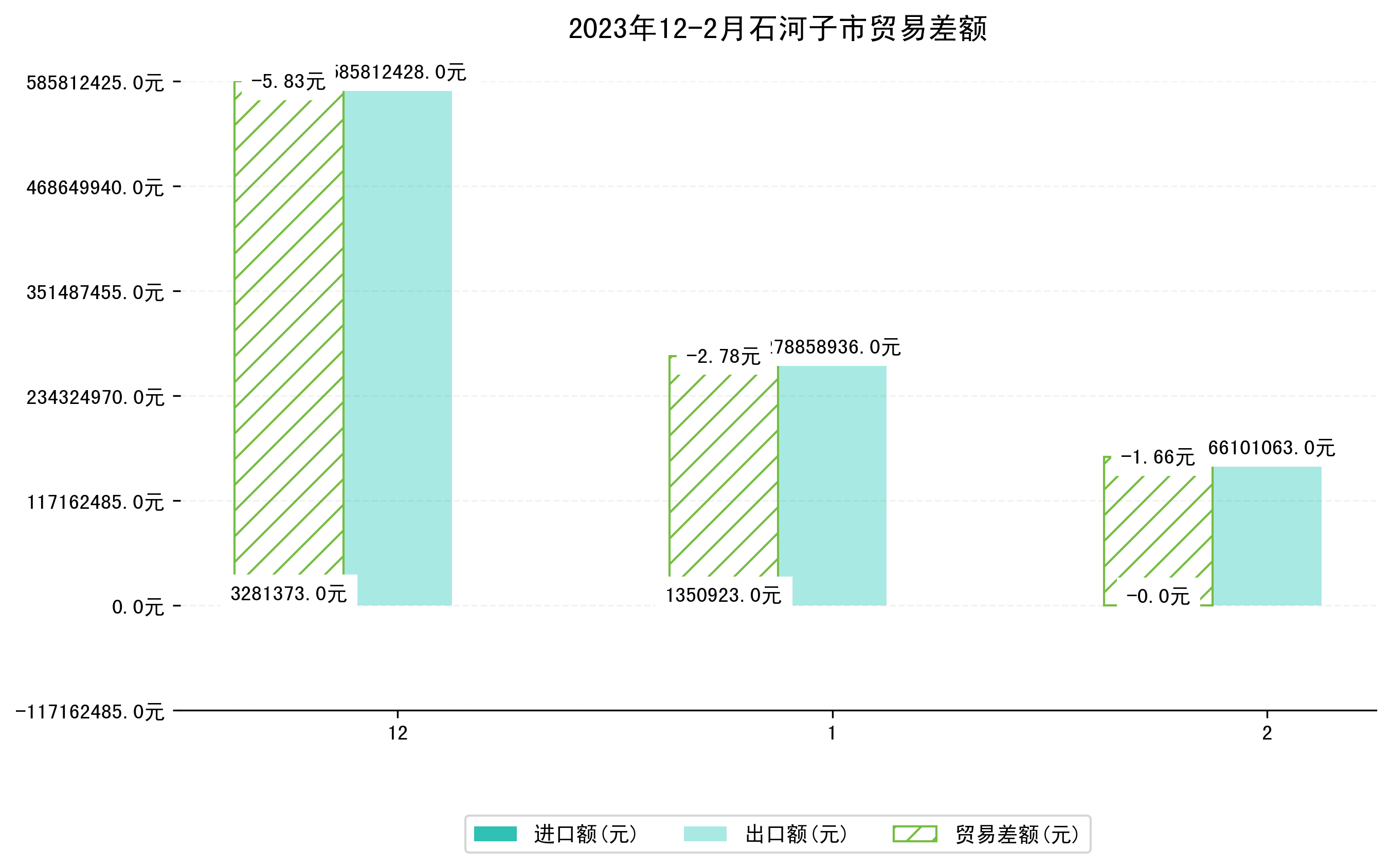 以人民币计,2023年2月石河子市贸易差额为1,6610,1063万元(贸易顺差),相比上月减少了1,1140,6950万元,即1530,4313万美元;相比上年同期减少了2,0169,6472万元,同比减少-54.84%。