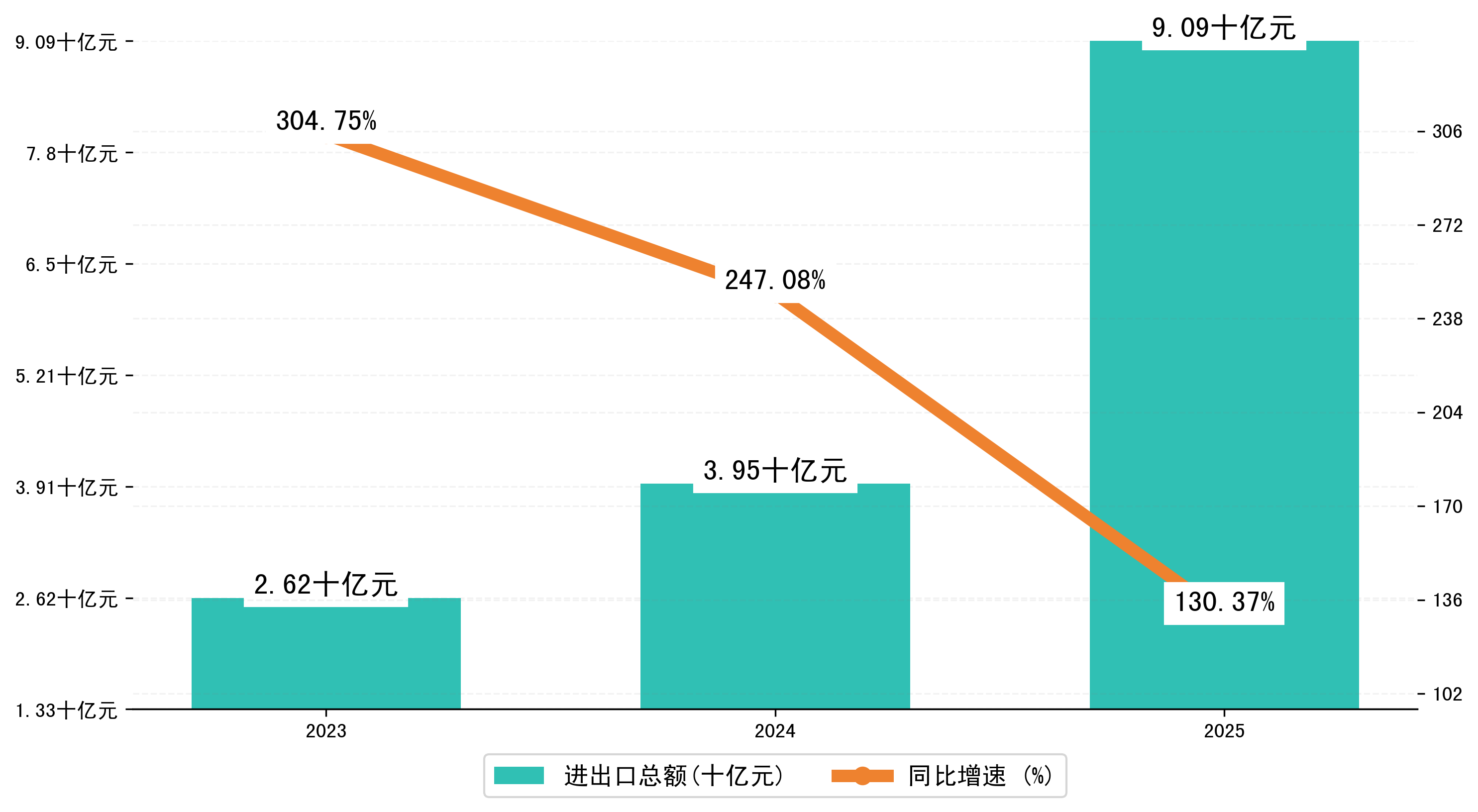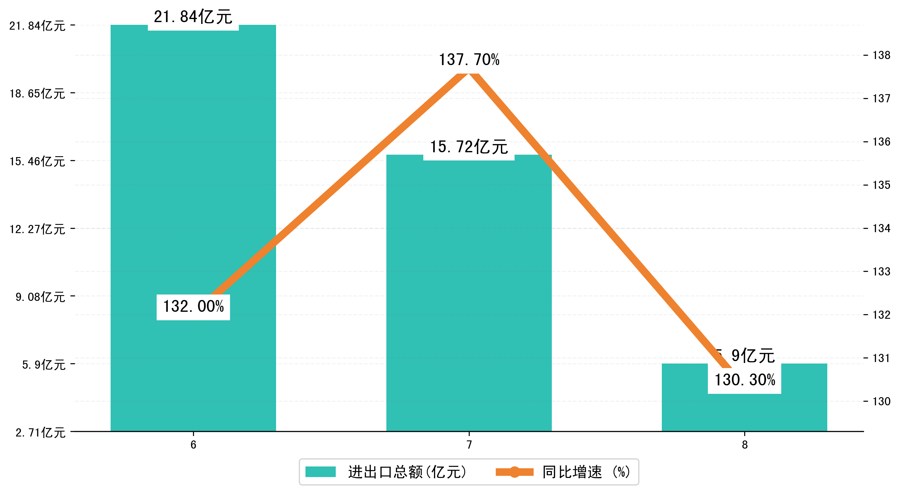 以美元计,2025年1-8月石河子市进出口总额为12,6489.7983万美元,相比上年同期增加了7,0960.9164万美元,同比增加127.80%。