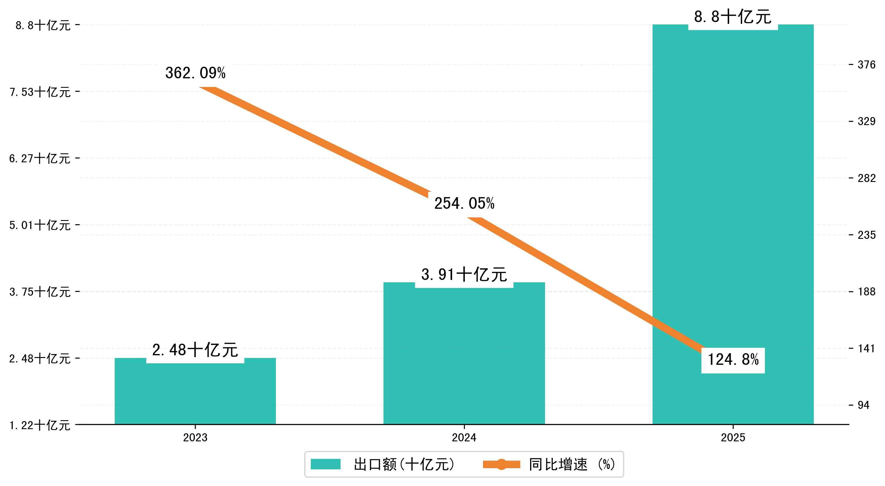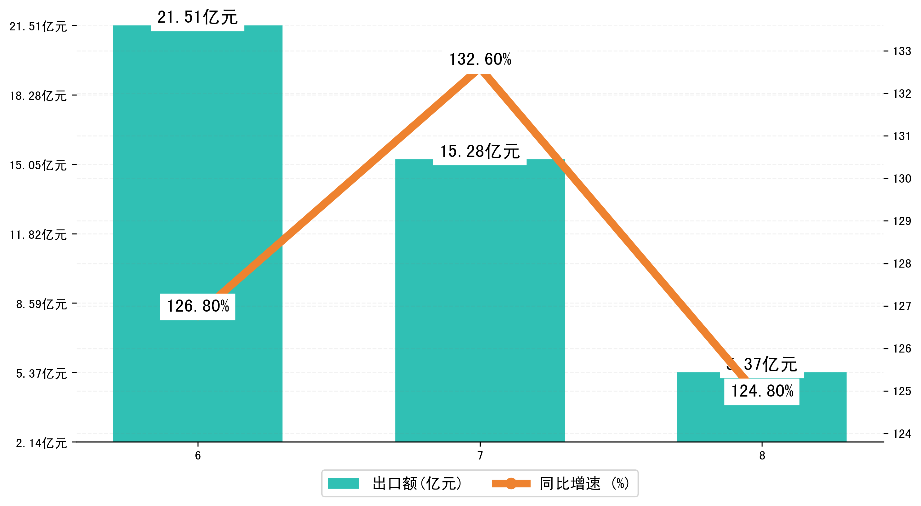 以人民币计,2025年1-8月石河子市出口额为87,9666.0389万元,相比上年同期增加了48,8363.436万元,同比增加了124.80%。