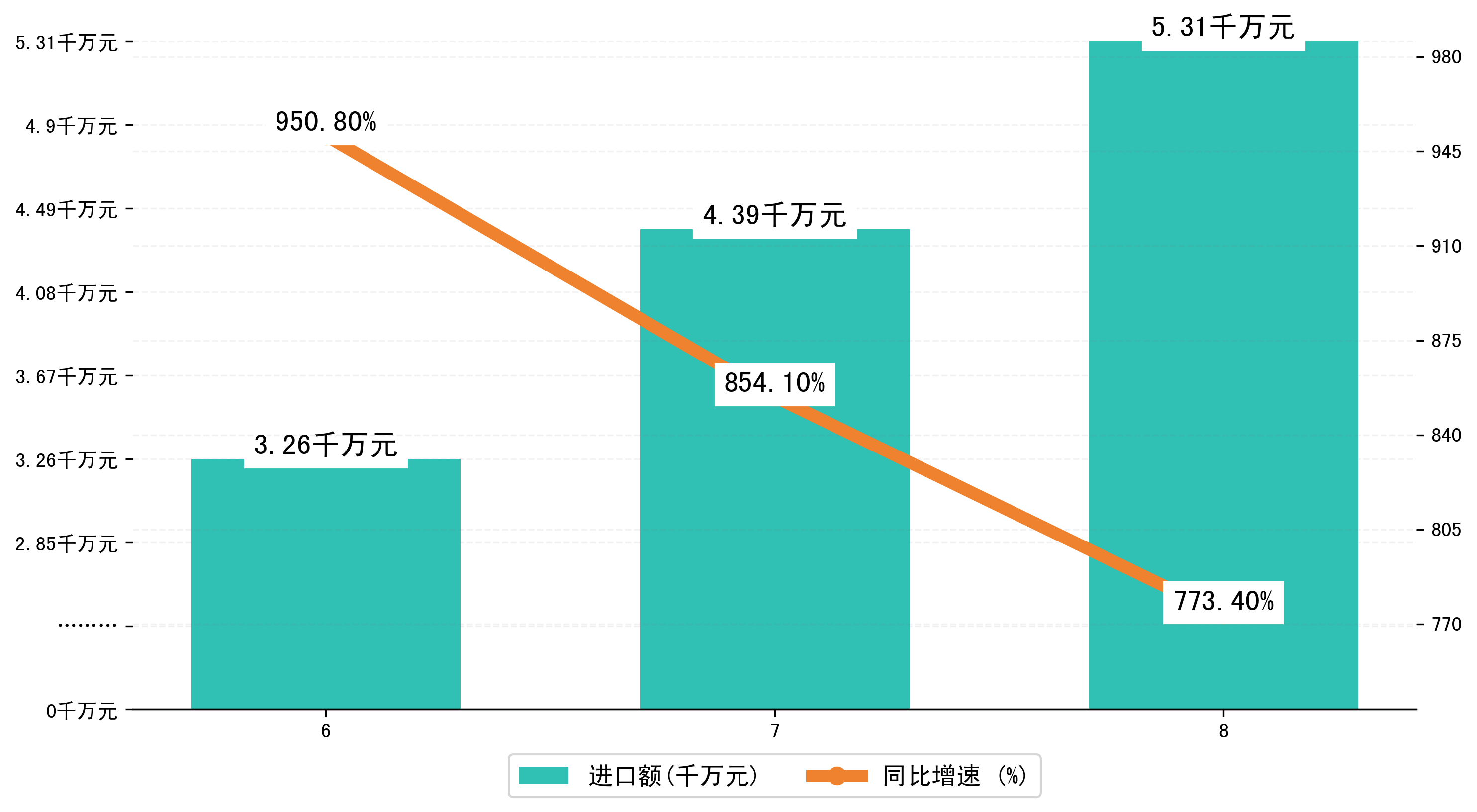 以人民币计,2025年1-8月石河子市进口额为2,9568.4557万元,相比上年同期增加了2,6183.1114万元,同比增加了773.40%。