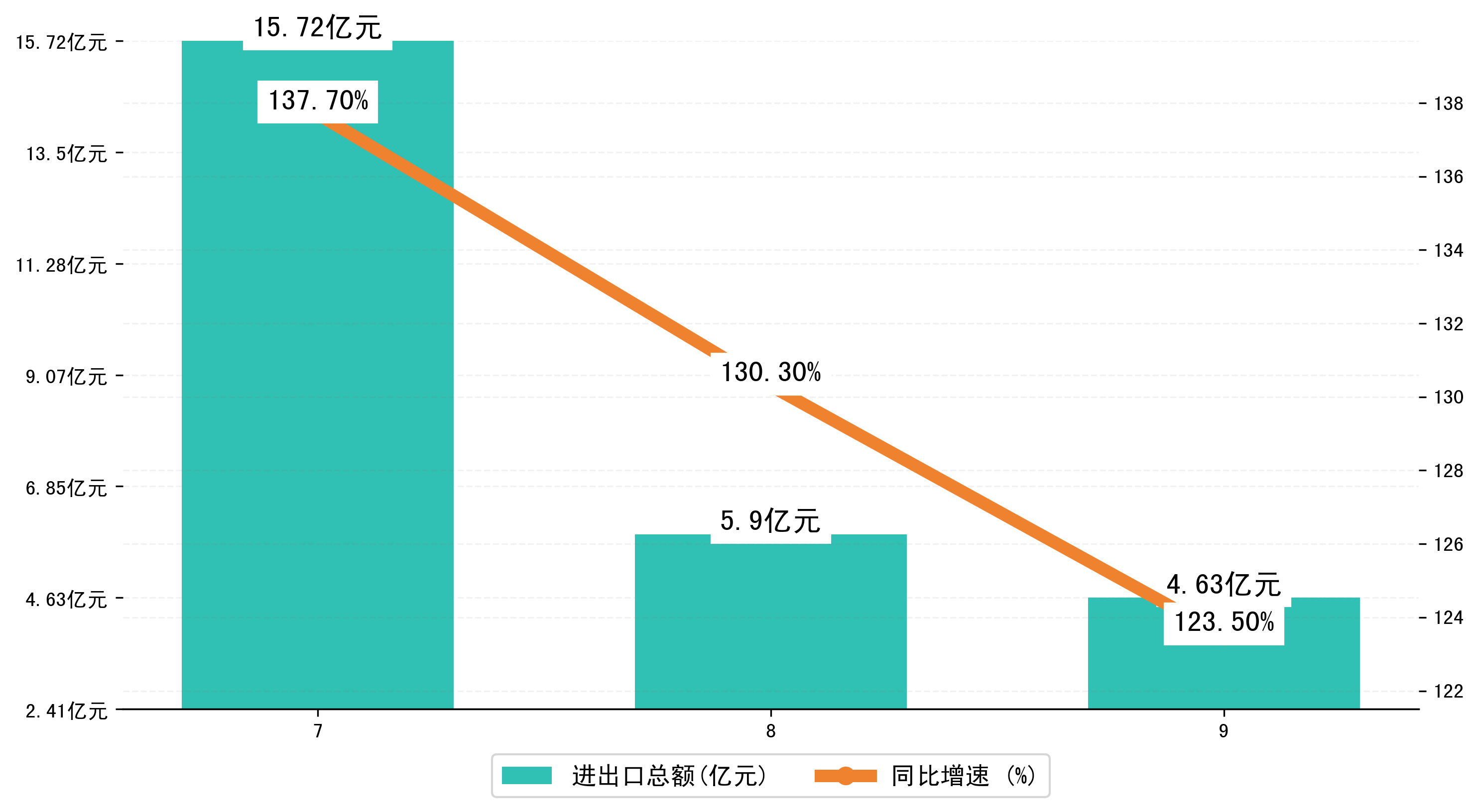 以人民币计,2025年1-9月石河子市进出口总额为95,5456.0526万元,相比上年同期增加了52,8028.52万元,同比增加了123.50%。