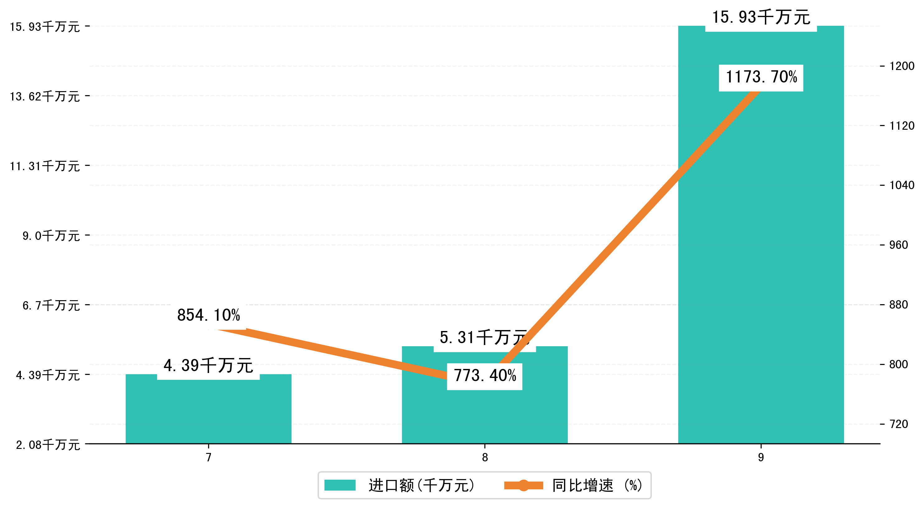 以人民币计,2025年9月石河子市进口额为1,5932.8937万元,相比上月增加了1,0624.9008万元;相比上年同期增加了1,5745.7841万元,同比增加了1173.70%。