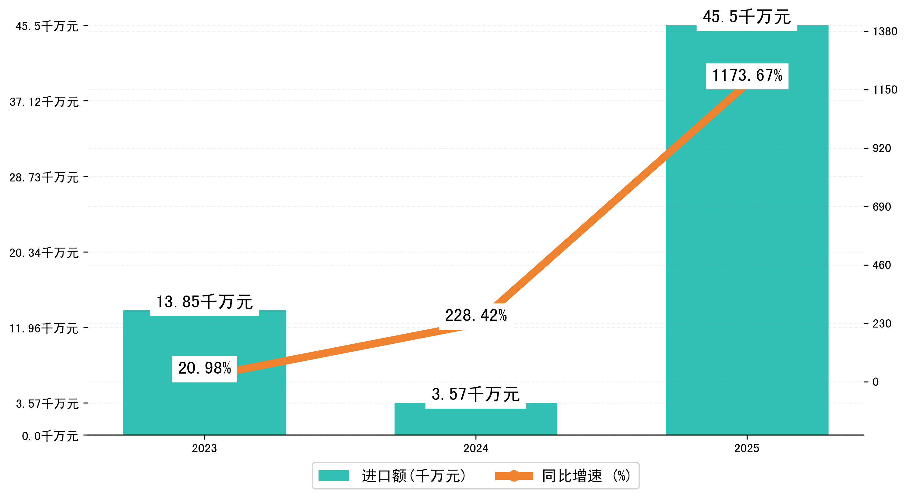 以美元计,2025年1-9月石河子市进口额为6348.6452万美元,相比上年同期增加了5848.3469万美元,同比增加1169.00%。