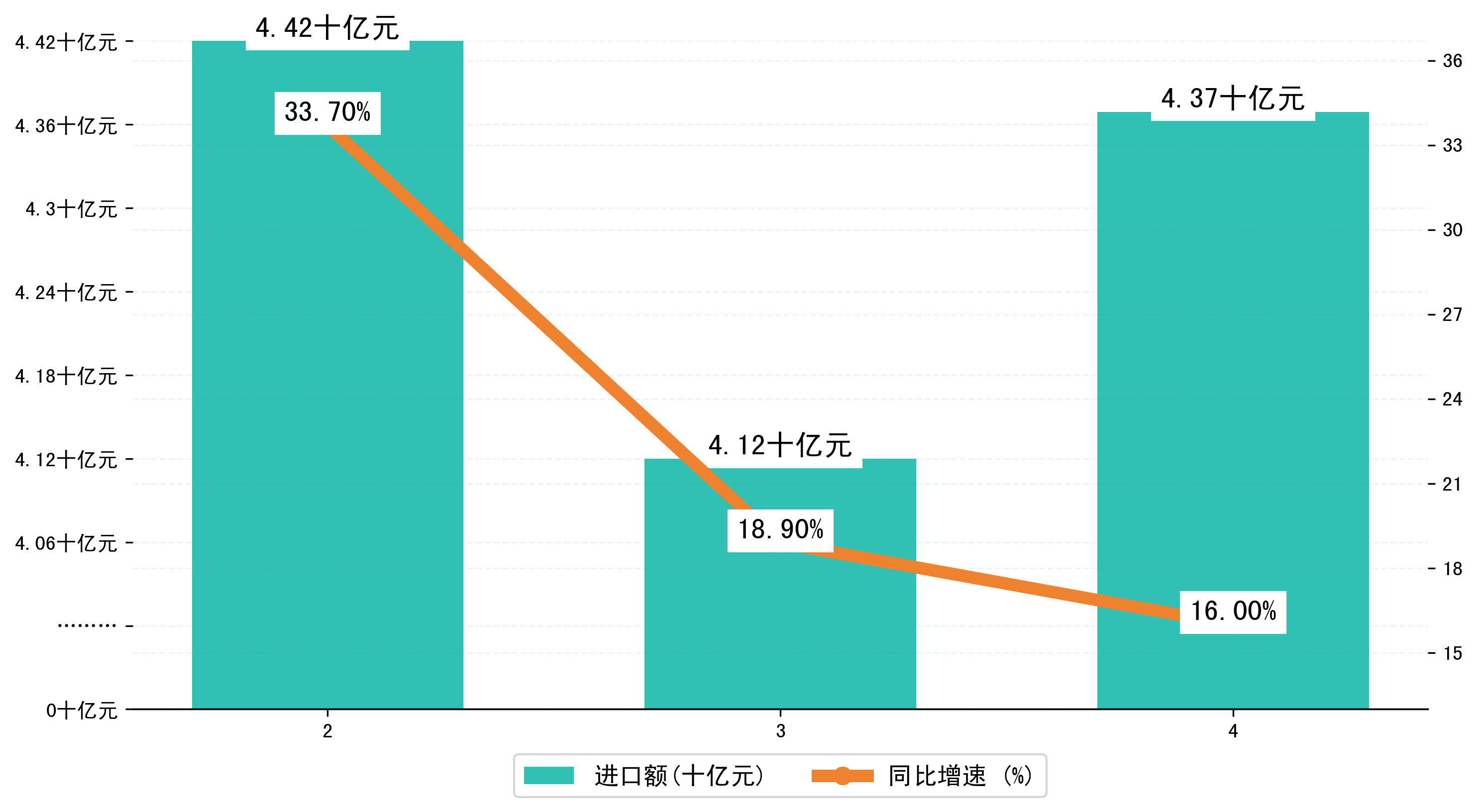 以人民币计,2024年4月石家庄市进口额为43,7138.7942万元,相比上月增加了2,5066.3806万元;相比上年同期增加了1,5434.1454万元,同比增加了16.00%。