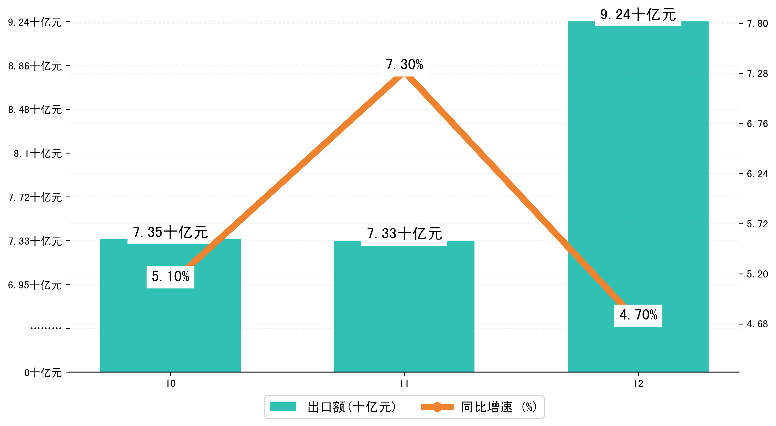 以人民币计,2024年12月石家庄市出口额为92,3793.8776万元,相比上月增加了19,0309.8172万元;相比上年同期减少了12,1889.5605万元,同比增加了4.70%。