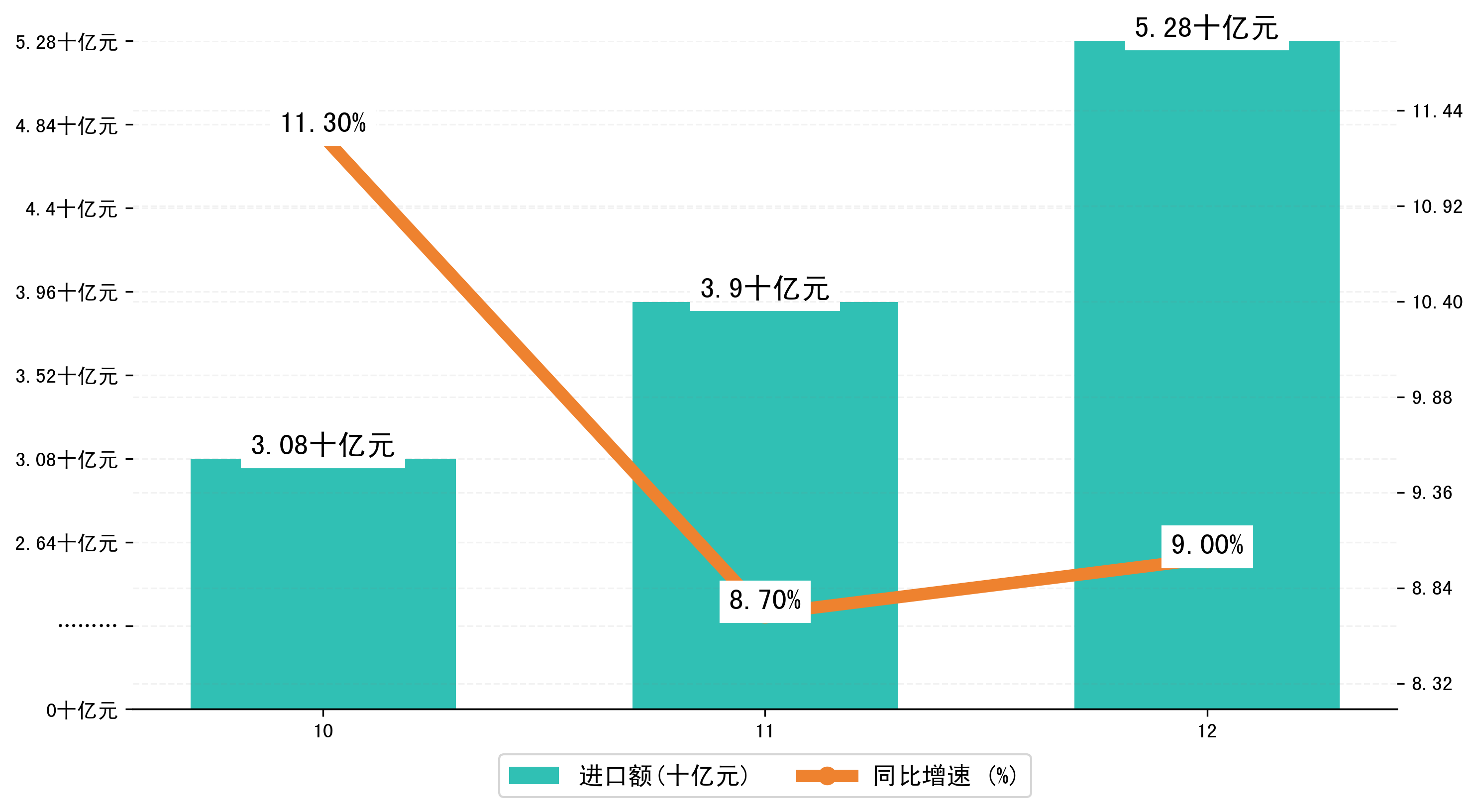 以人民币计,2024年12月石家庄市进口额为52,8161.0488万元,相比上月增加了13,7779.7508万元;相比上年同期增加了7,7221.3715万元,同比增加了9.00%。