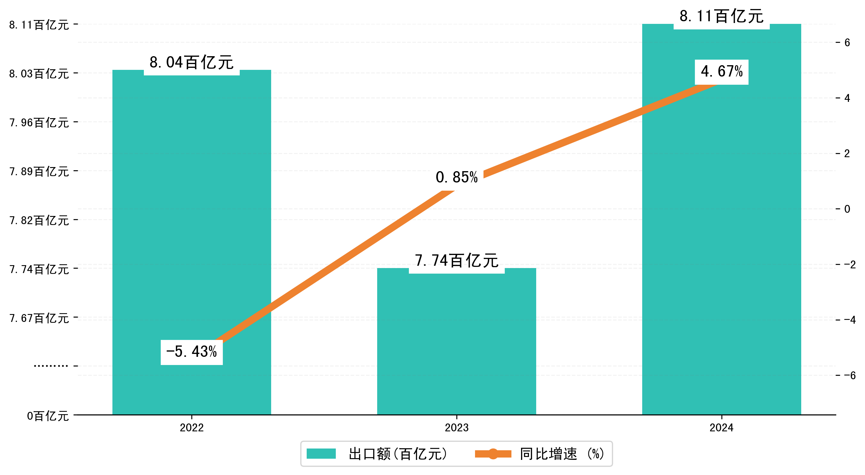 以人民币计,2024年1-12月石家庄市出口额为810,5320.6677万元,相比上年同期增加了36,1877.2541万元,同比增加了4.70%。