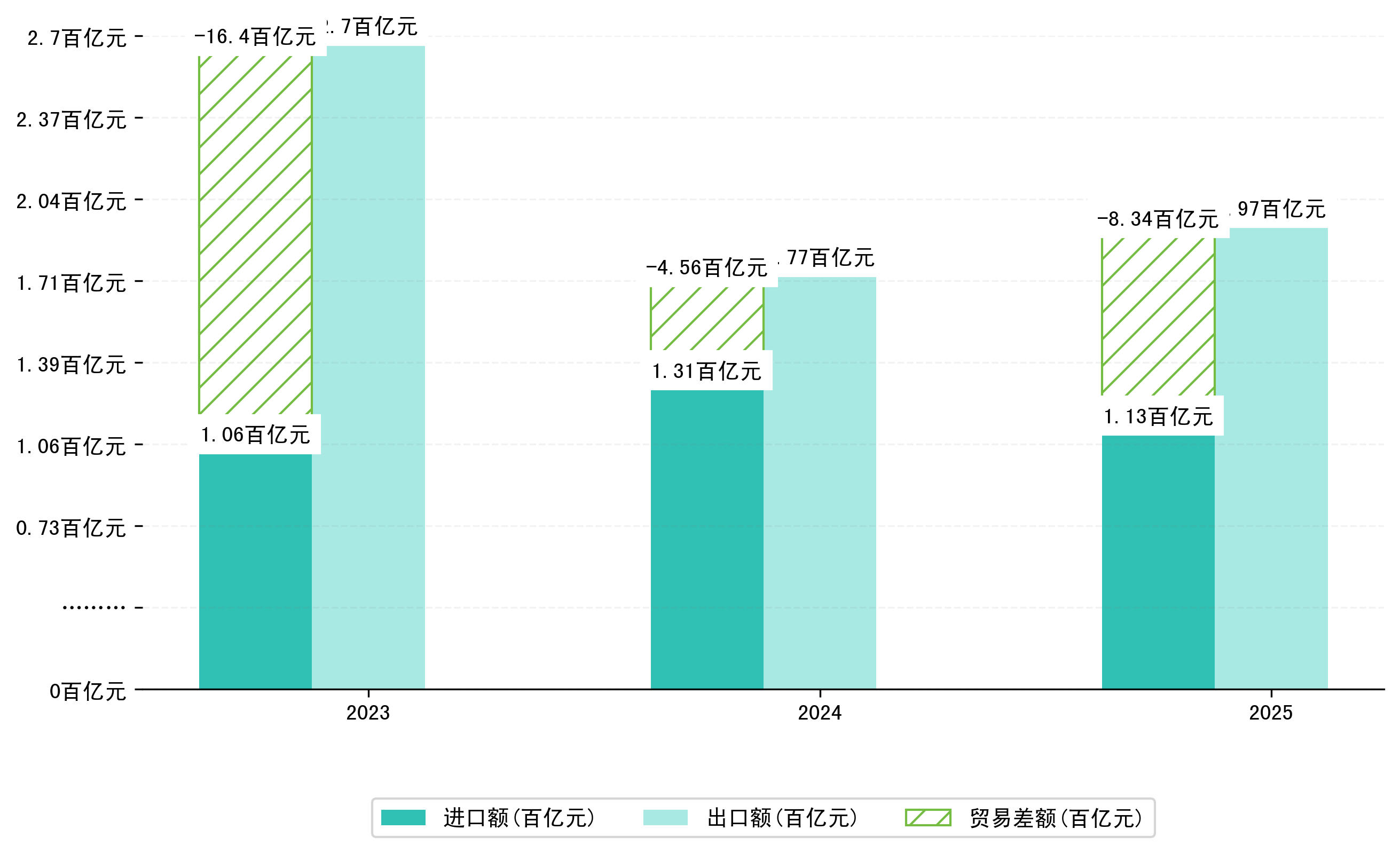 以美元计,2025年1-3月石家庄市贸易差额为11,6035,5149万美元(贸易顺差),相比上年同期增加了5,1940,4862万美元,同比增加81.04%。