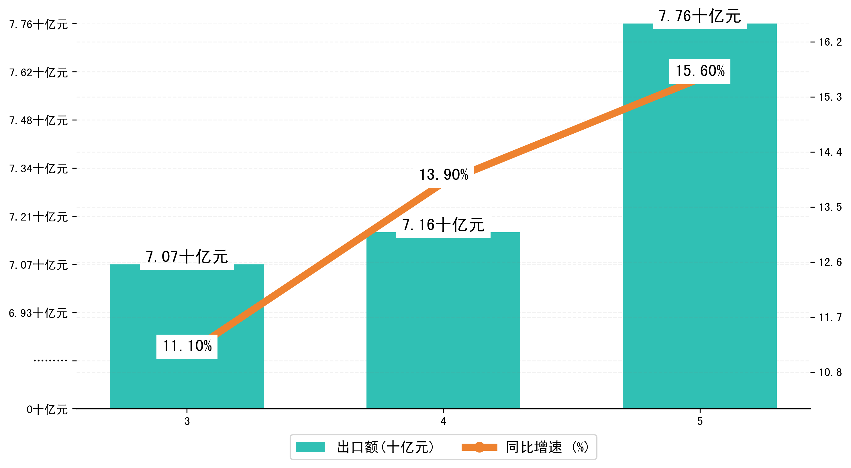 以人民币计,2025年5月石家庄市出口额为77,5865.4031万元,相比上月增加了5,9943.9862万元;相比上年同期增加了13,8522.3829万元,同比增加了15.60%。