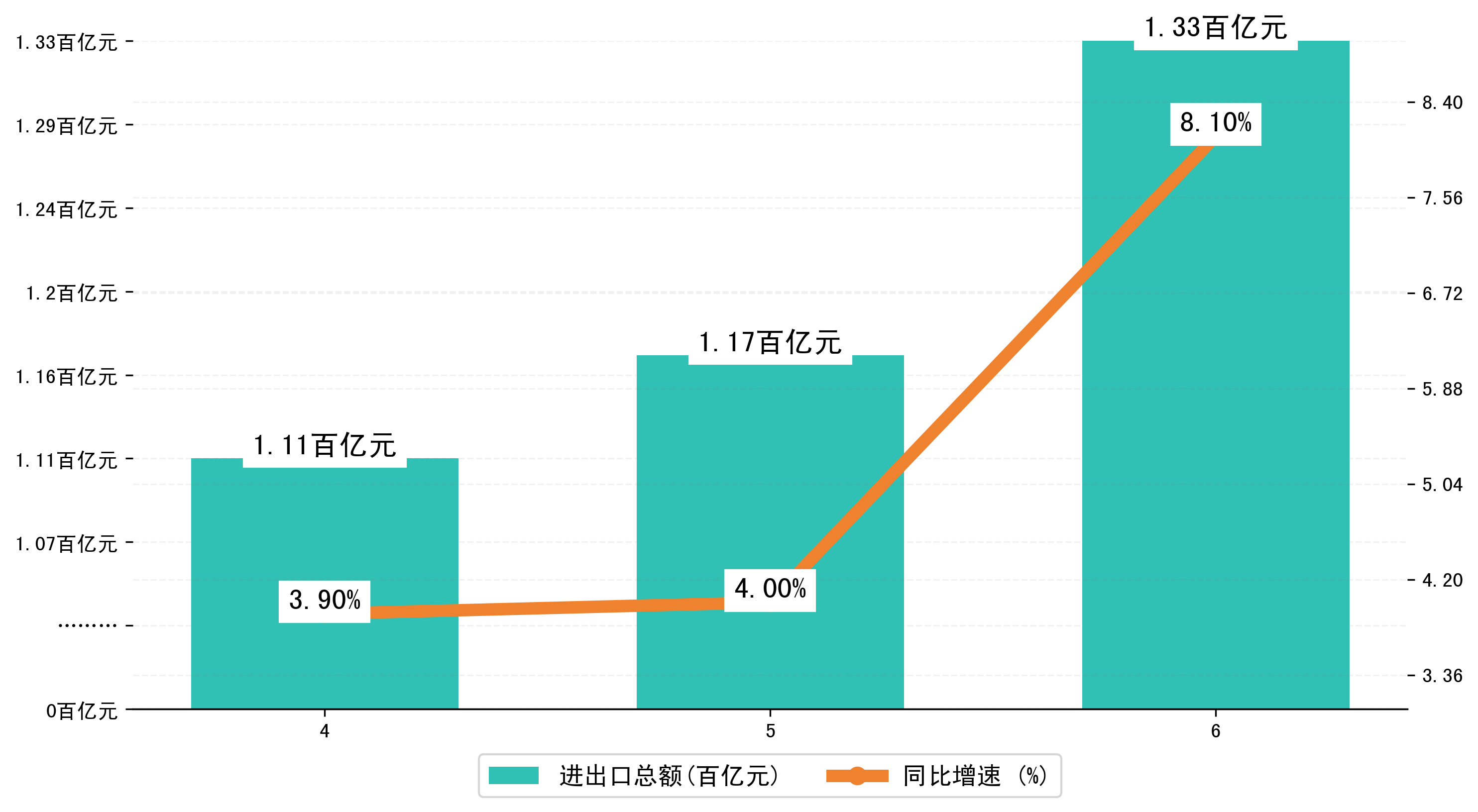 以人民币计,2025年6月石家庄市进出口总额为132,9045.3634万元,相比上月增加了16,1421.3537万元;相比上年同期增加了29,1812.3472万元,同比增加了8.10%。