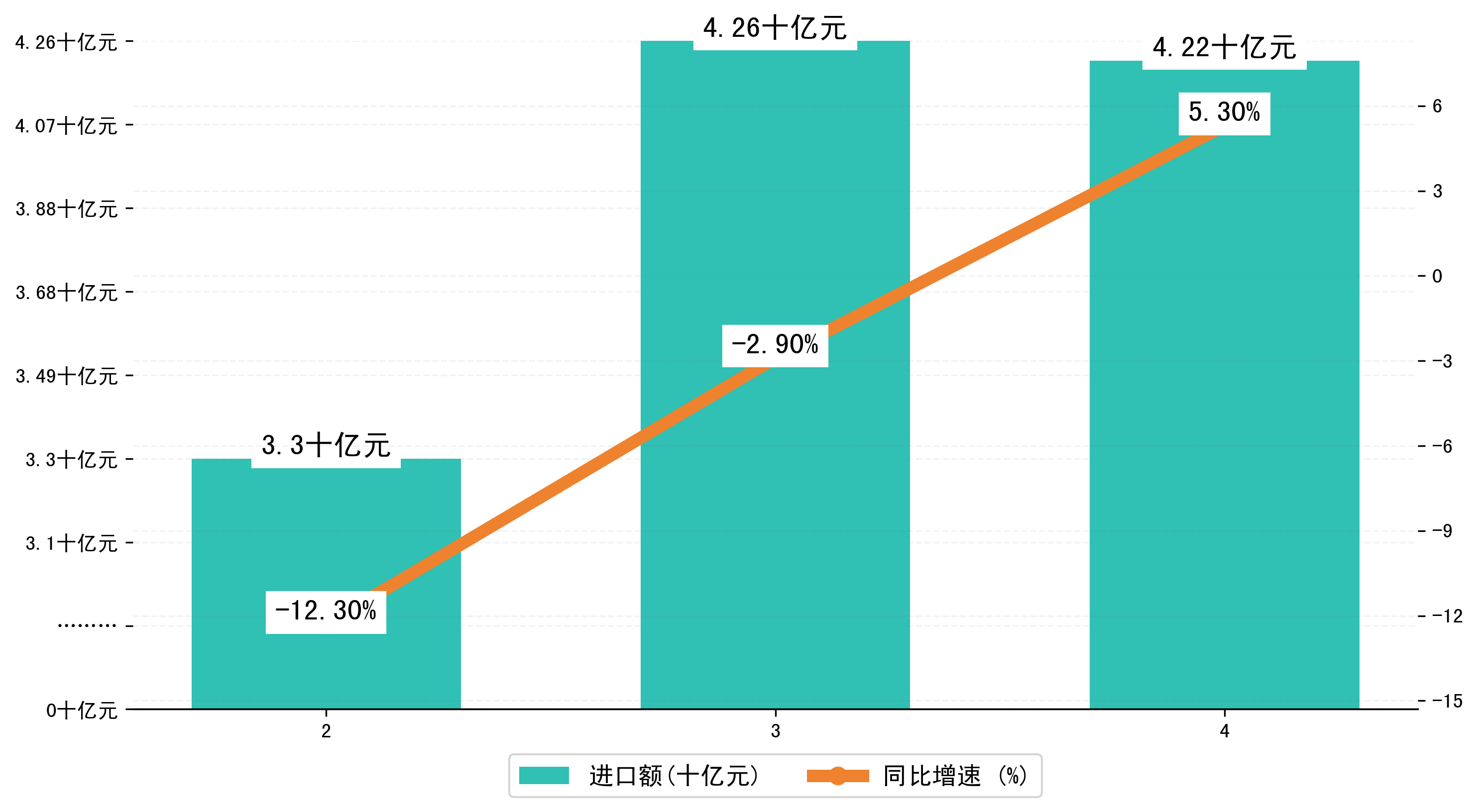以人民币计,2023年4月石家庄市进口额为42,1704.6488万元,相比上月减少了4554.0289万元;相比上年同期增加了11,0275.1667万元,同比增加了5.30%。