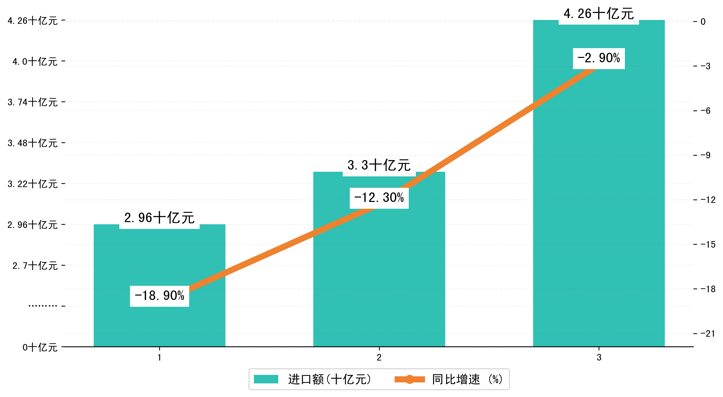 以美元计,2023年1-3月石家庄市进口额为15,4121.495万美元,相比上年同期增加了1845.0238万美元,同比减少-9.80%。