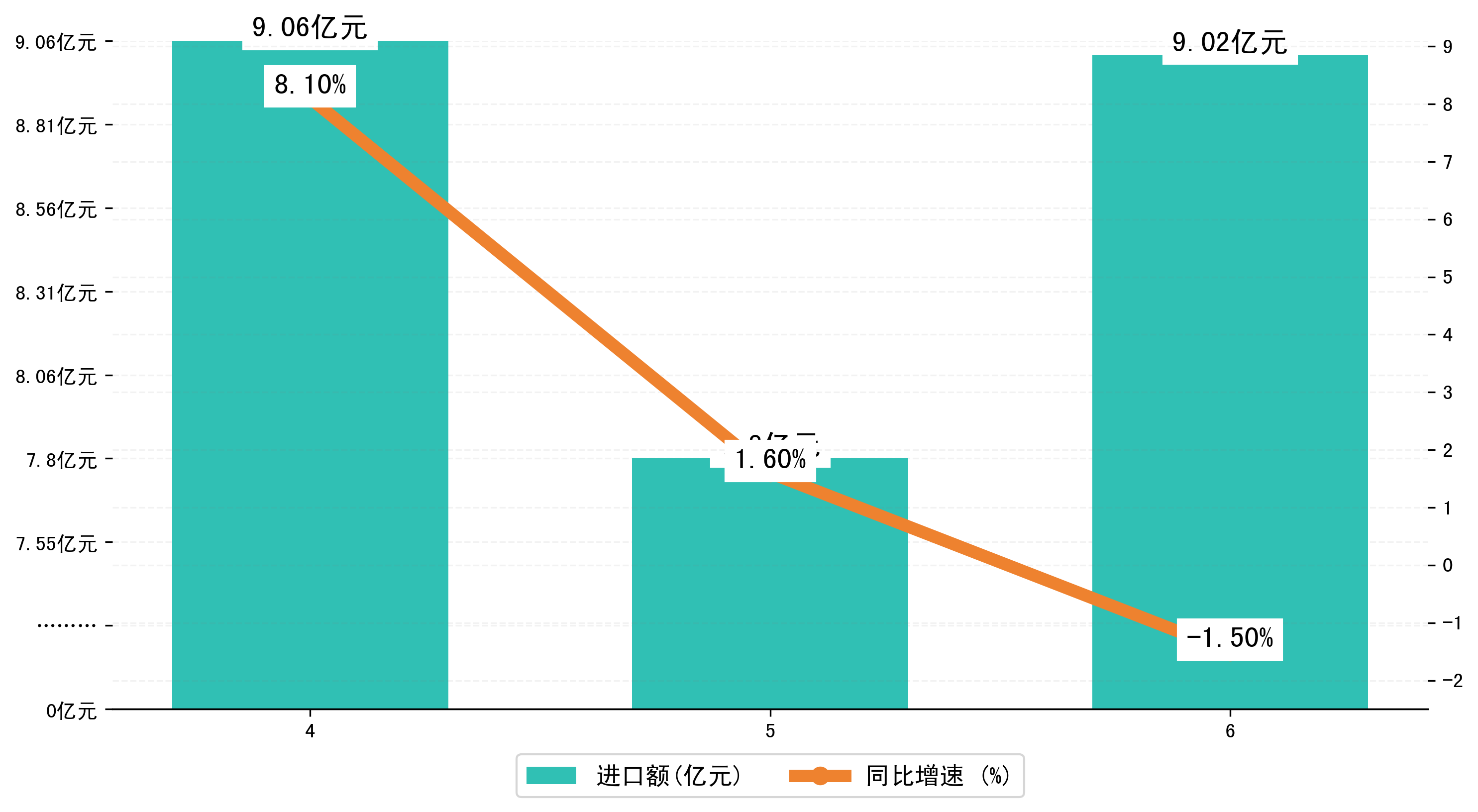 以美元计,2024年1-6月绥芬河市进口额为8,1039.3334万美元,相比上年同期减少了3390.9708万美元,同比减少-4.10%。