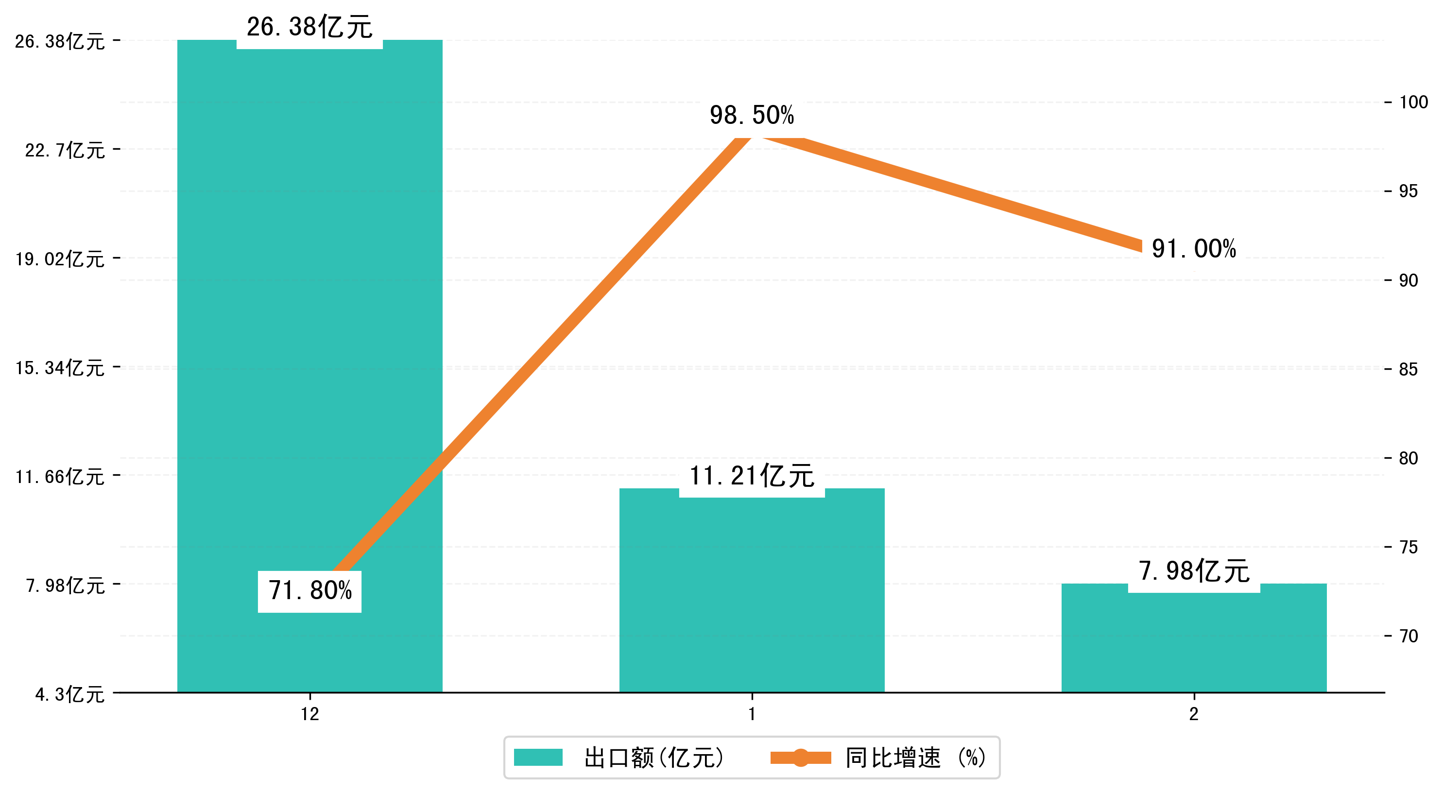 以美元计,2024年2月绥芬河市出口额为1,1229.693万美元,相比上月减少了4570.3461万美元;相比上年同期增加了4732.4214万美元,同比增加85.10%。