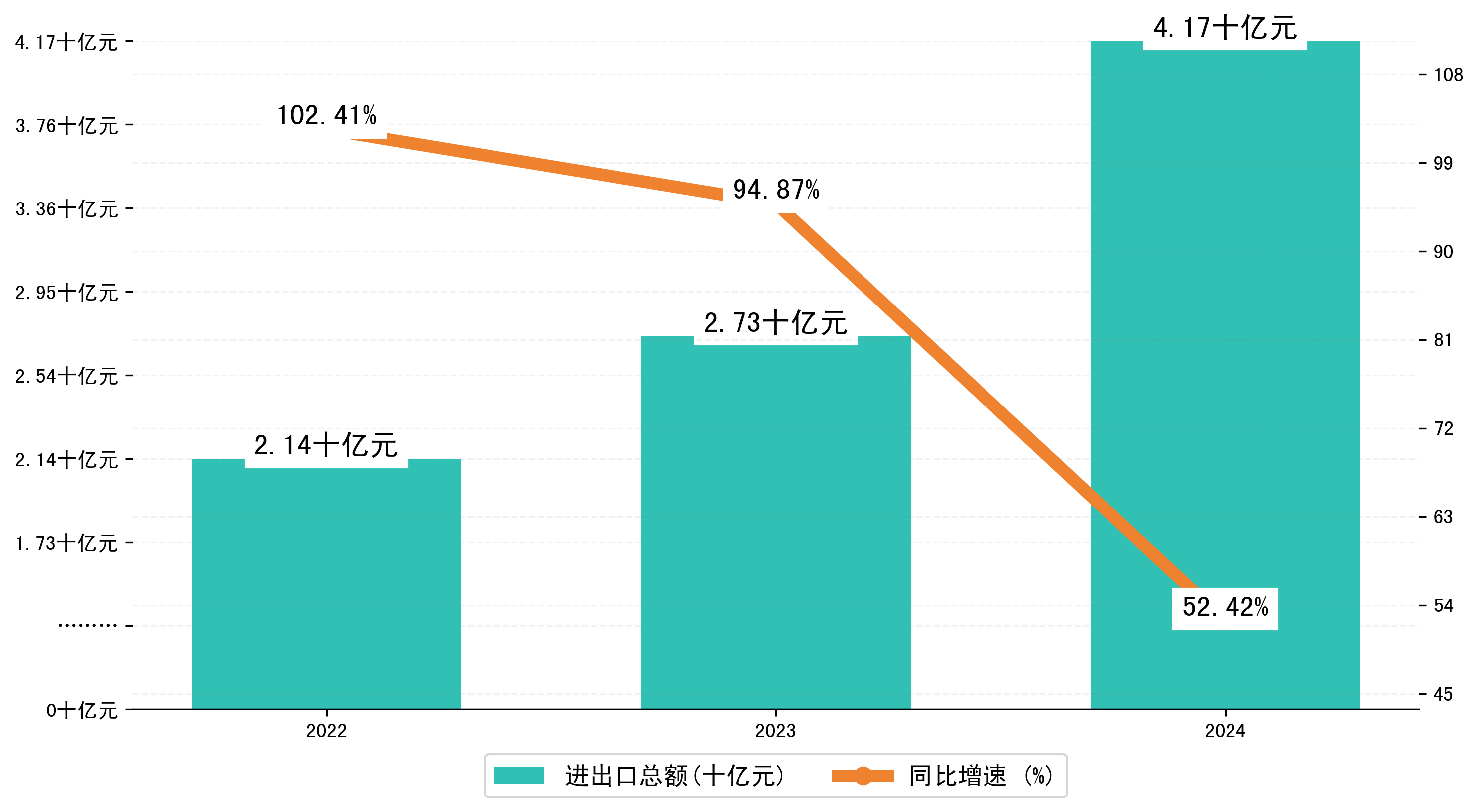 以人民币计,2024年1-2月绥芬河市进出口总额为41,6683.4854万元,相比上年同期增加了14,3297.9984万元,同比增加了51.80%。